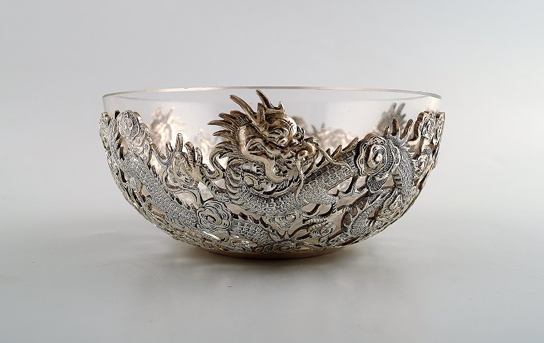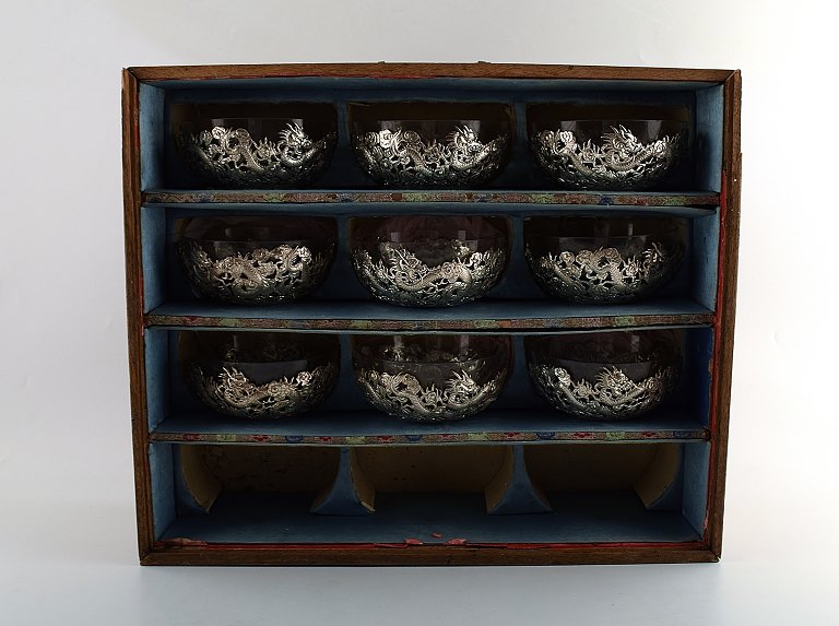 Set of 9 Chinese rinsing bowls of silver, with inserts of transparent glass.