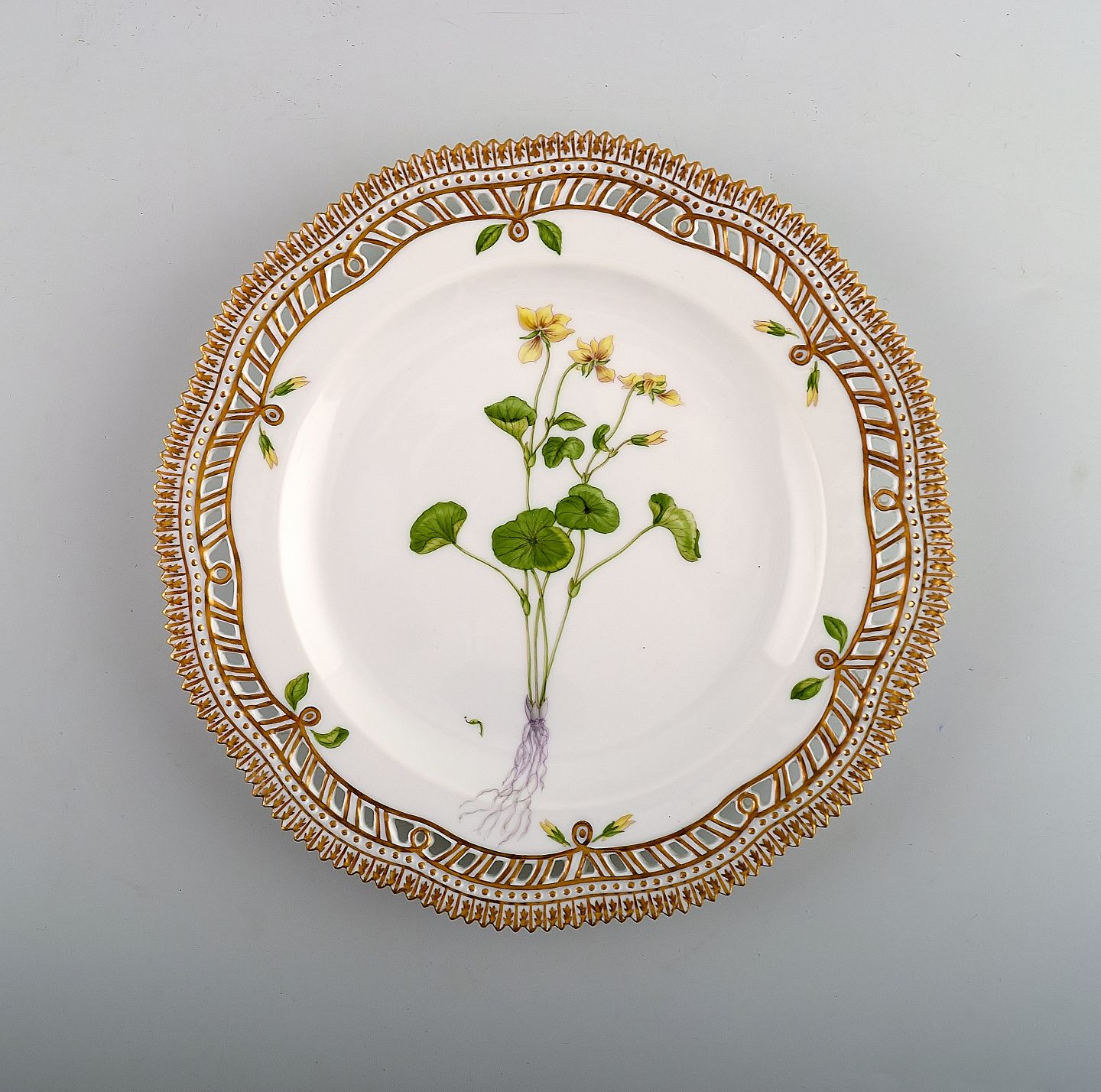 Royal Copenhagen Flora Danica openwork plate # 20/3554. 23 cm. in diameter. Latin name: Viola biflora 1. Quality, in perfect condition.