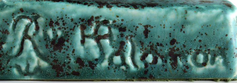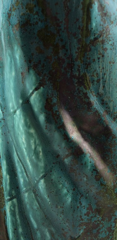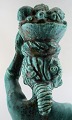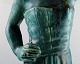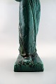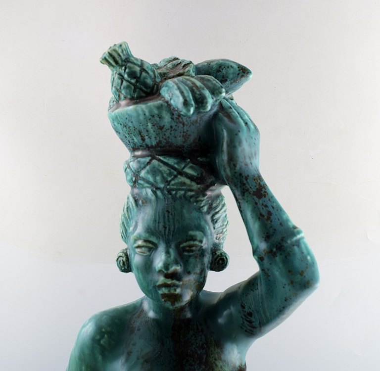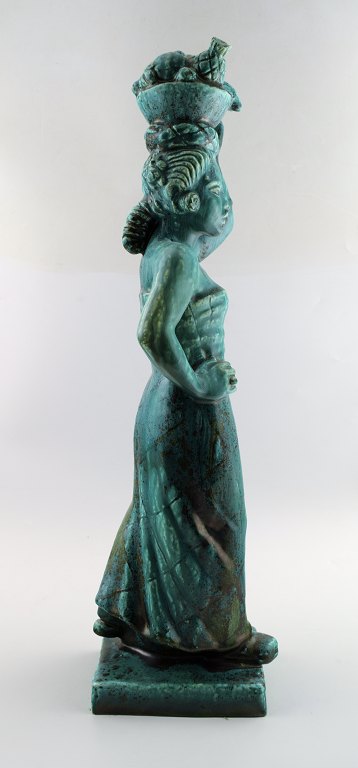Harald Salomon for Rörstrand, grønglaseret keramikfigur forestillende kvinde bærende frugter i fad på hovedet. Stemplet. I perfekt stand. Højde: 55 cm. Bredde : 15 cm.
