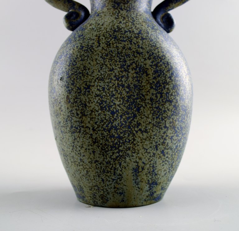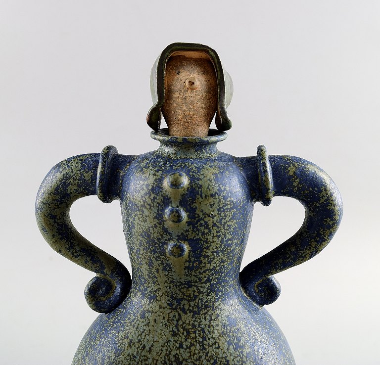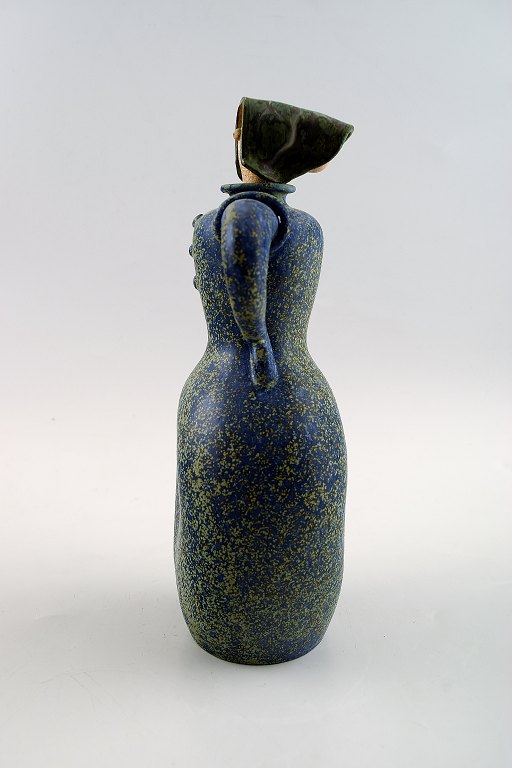 Sjælden Arne Bang. Keramik flaske/karaffel med prop, kvindefigur. 1940´erne. Flot glasur i grønne og blå nuancer. I perfekt stand. Stemplet "AB" Højde: 21 x 11 cm.