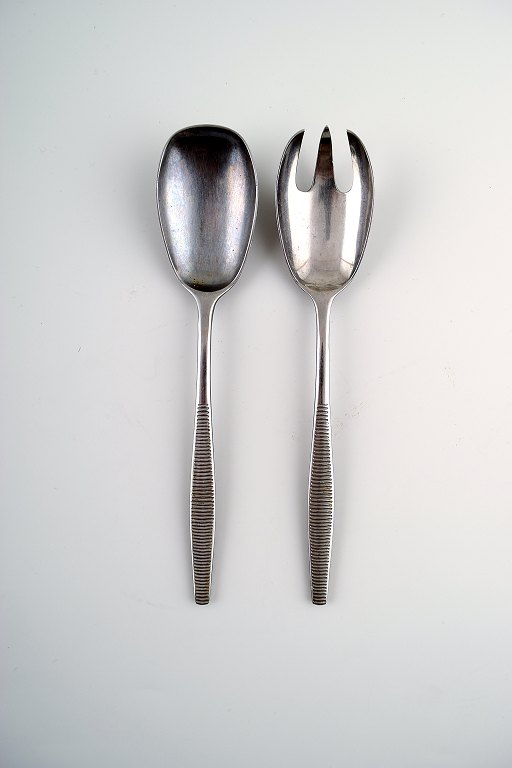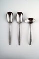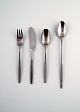 4 Middagsgafler (L. 20,5 cm), 4 middagsknive, 4 middagsskeer, 4 frokostkniv (L. 17 cm), 4 Dessertskeer (16,5 cm), 4 frokostgafler, 4 Cafelattéskeer/isteskeer (22,5 cm.) sovseske, salatsæt, 2 serveringsskeer.