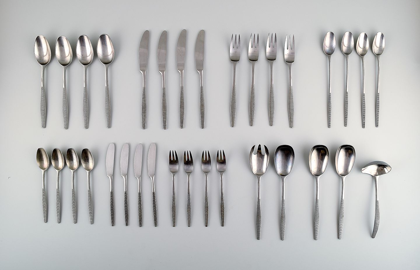 Jens H. Quistgaard "Variation VI" komplet 4 personers bestik af håndsmedet rustfrit stål. I alt 33 dele.