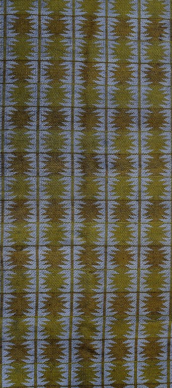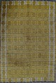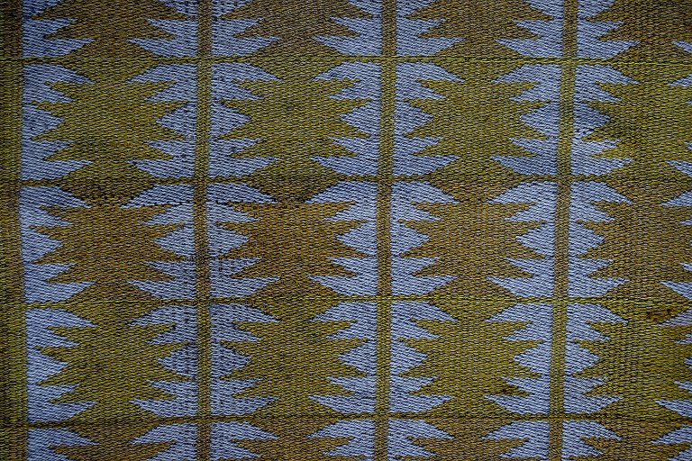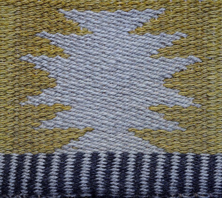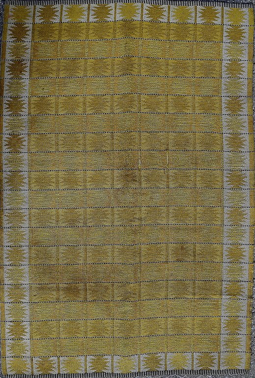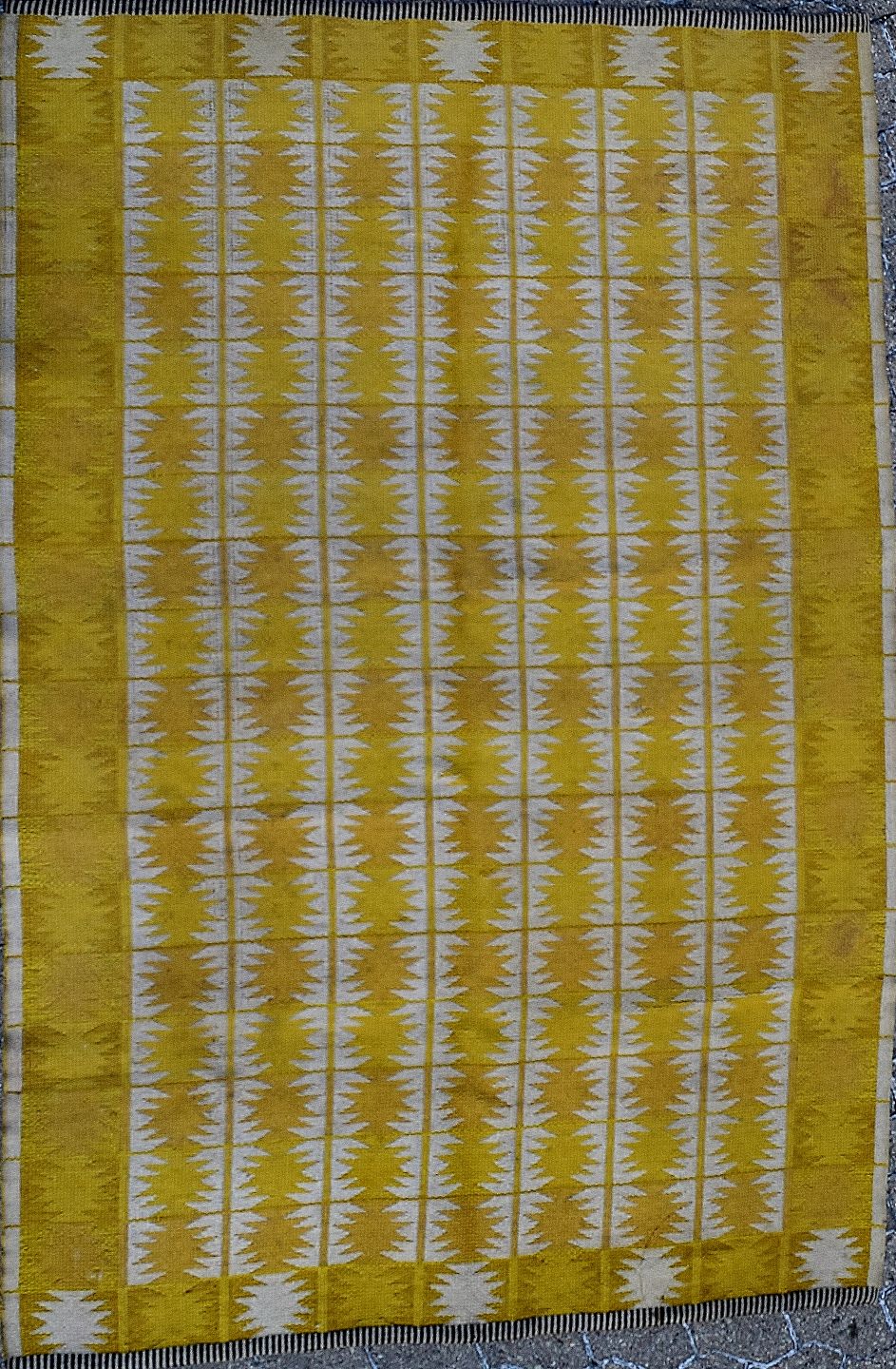 Rölakan tæppe med geometrisk mønster i gule nuancer. Sverige, midt 1900-tallet. L. 210 cm. B. 158 cm. Almindelige brugstegn.