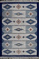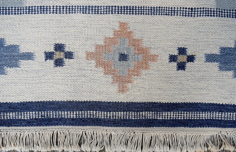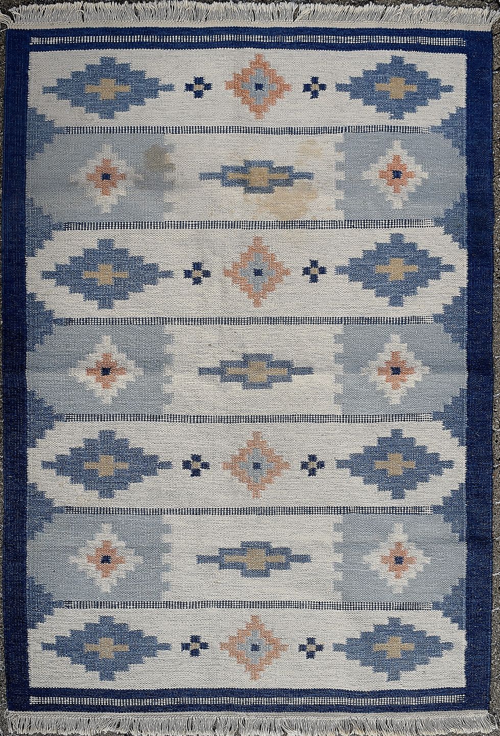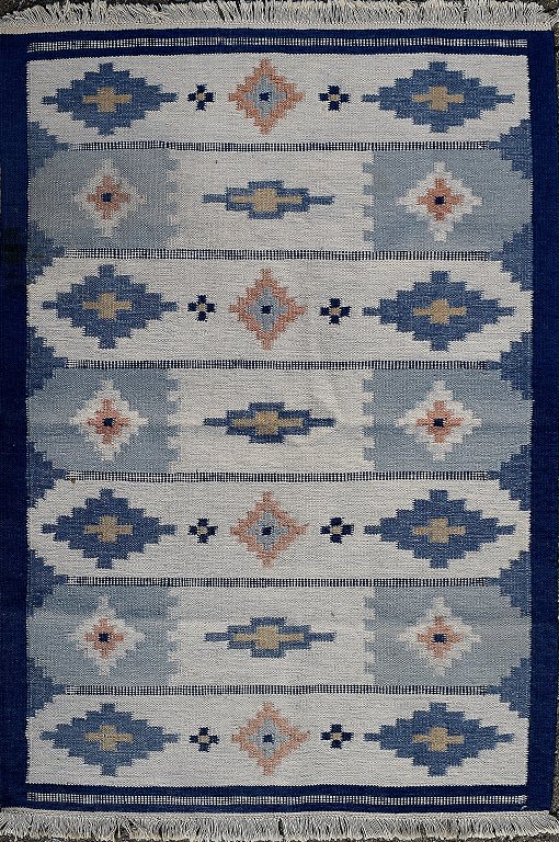 Rölakan carpet with geometric pattern in shades of blue. Sweden mid 20 c. L. 200 cm. W. 143 cm. Common use signs. A few spots.