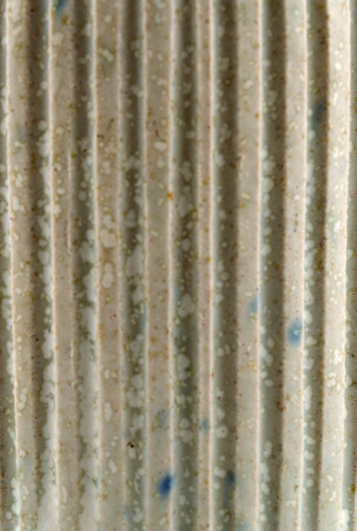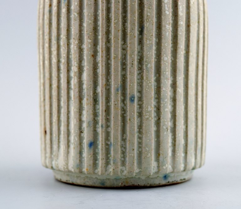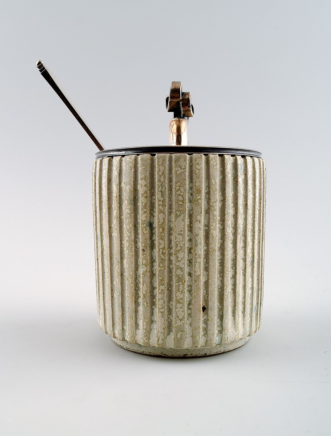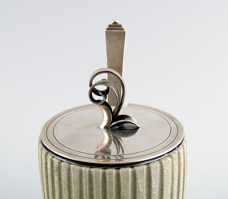 Arne Bang and Georg Jensen: Jam Jar in stoneware modeled with vertically fluted pattern. Decorated with light gray glaze.