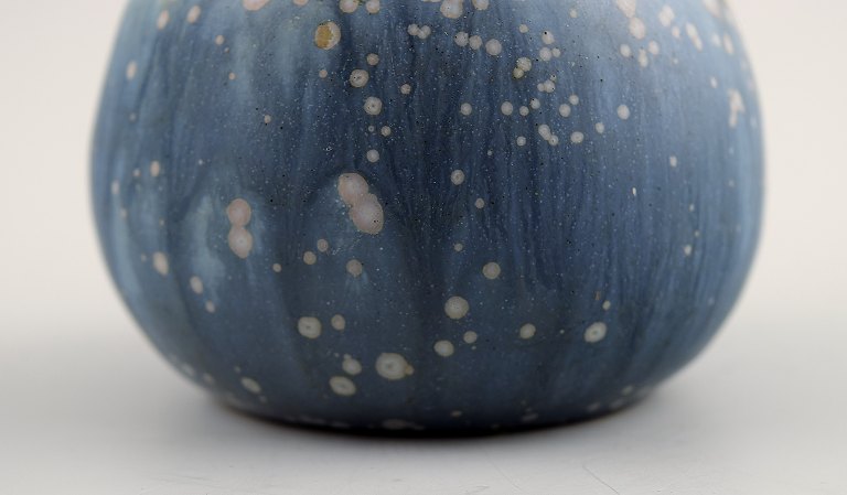 Jam jar in stoneware in bird eggs glaze decorated with green elements.