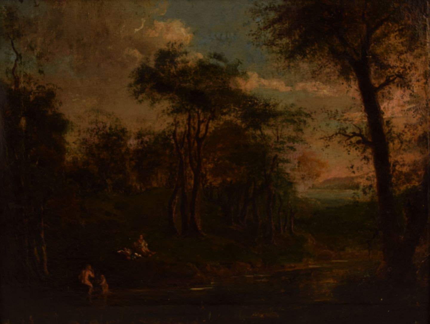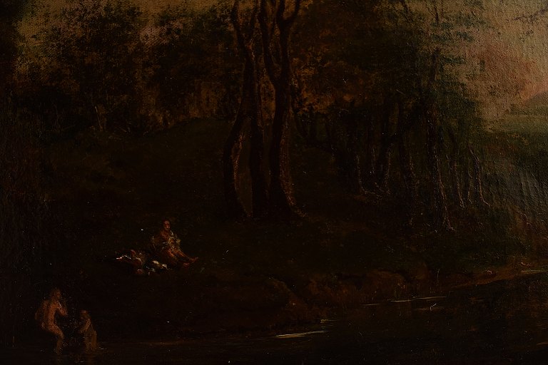Ubekendt Old master. Olie på lærred, Fra 1700 tallets slutning, 1800-tallets begyndelse. Personer bader i skovsø. Olie på lærred. Usigneret. 35 x 45 ( 42 x 52 ) cm. I god stand.