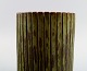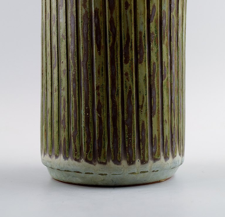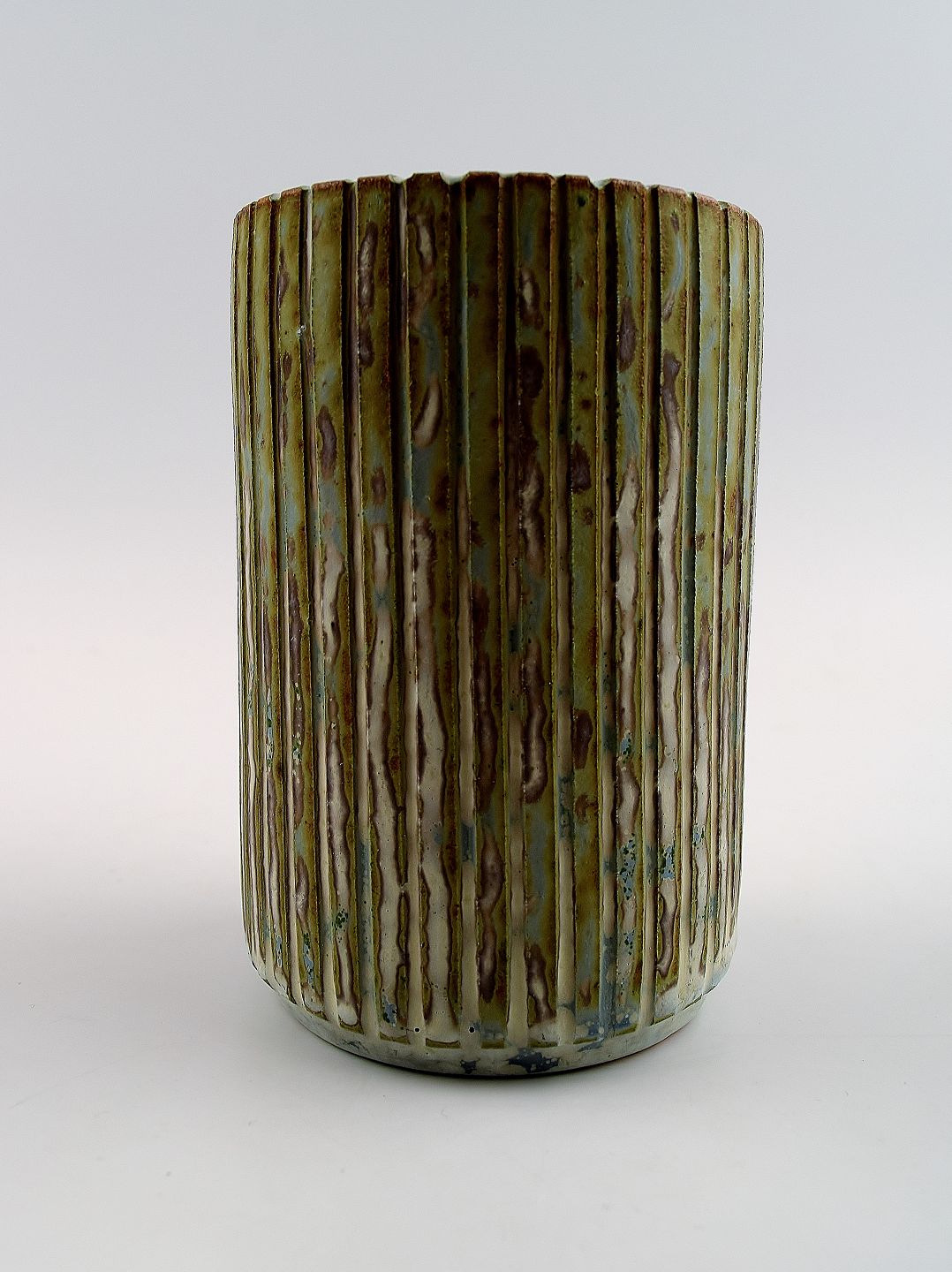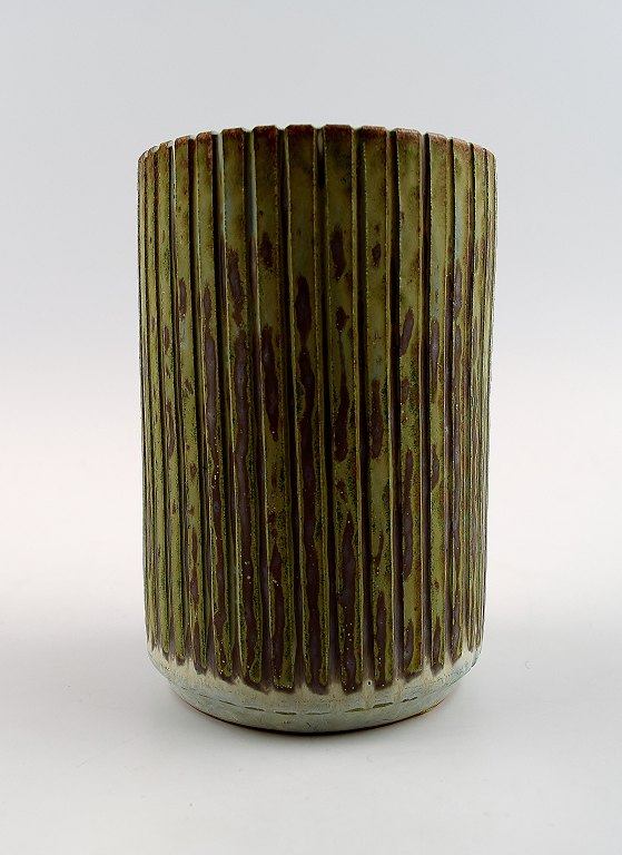 Arne Bang. Ceramic Vase, fluted design. Stamped AB. Beautiful glaze in green and brown nuances. In perfect condition. Measures 12 cm. x 7.5 cm.