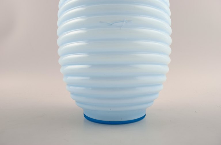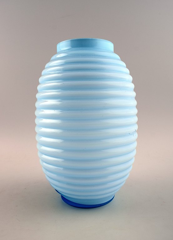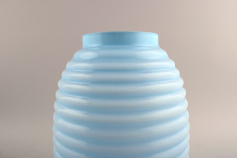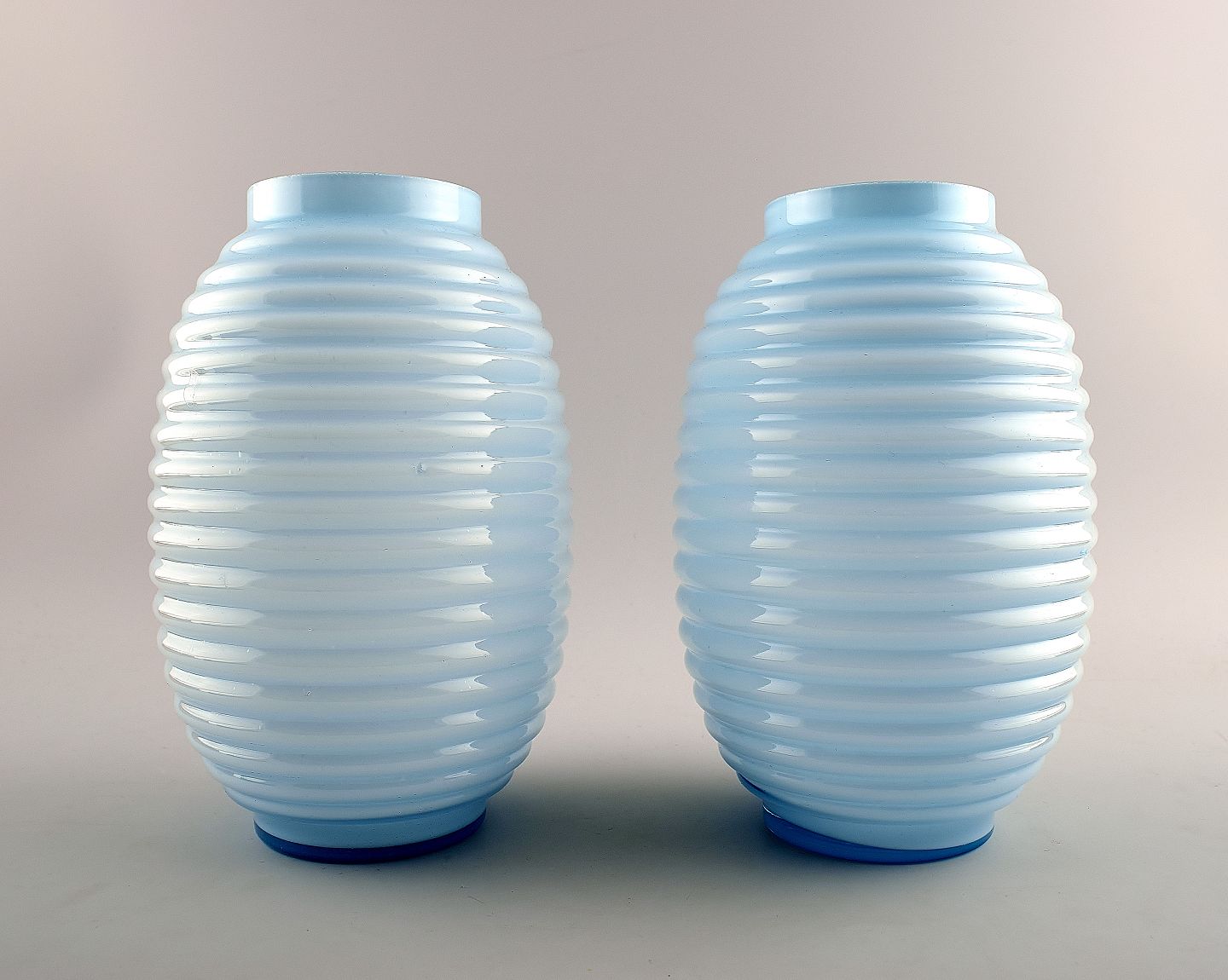 A pair of French Art Deco art glass vases in turquoise opaline glass. Measures 23 cm. In good condition, one vase with minor crack.