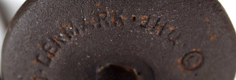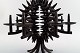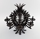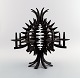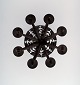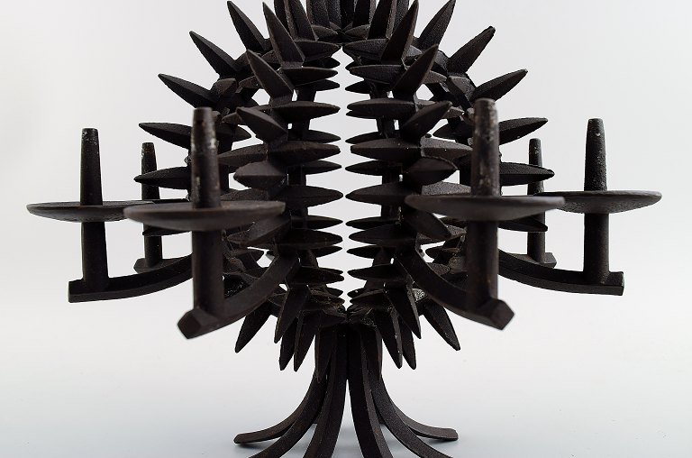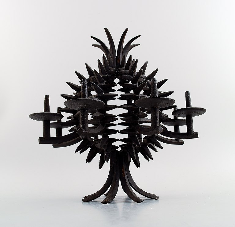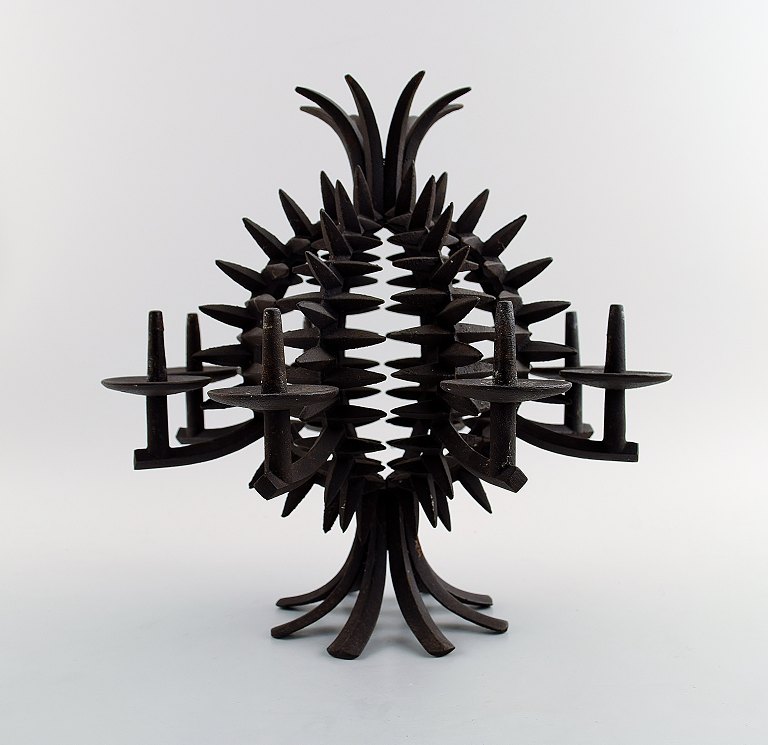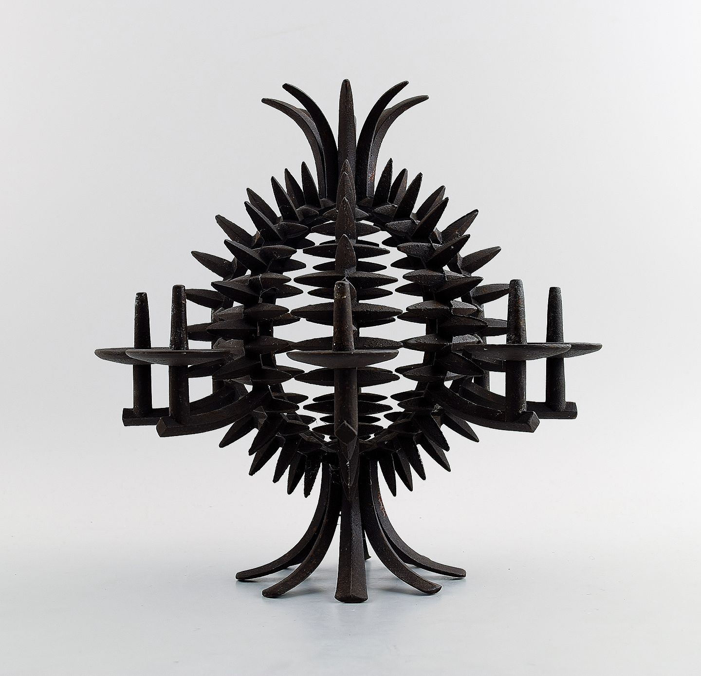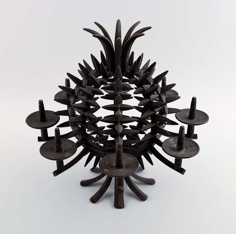 A circular, pineapple shaped candlestick of patinated iron. Eight candle holders/spears.