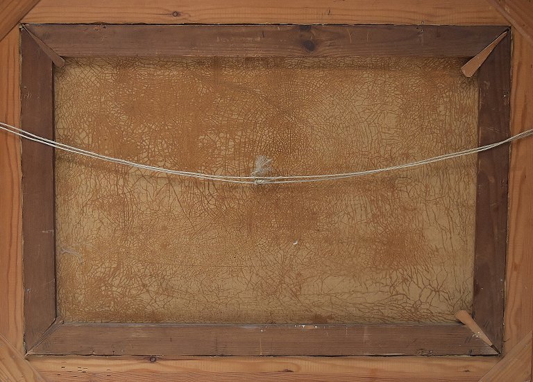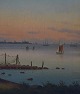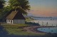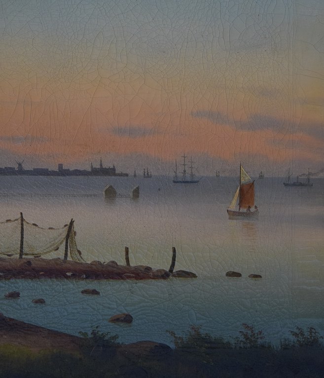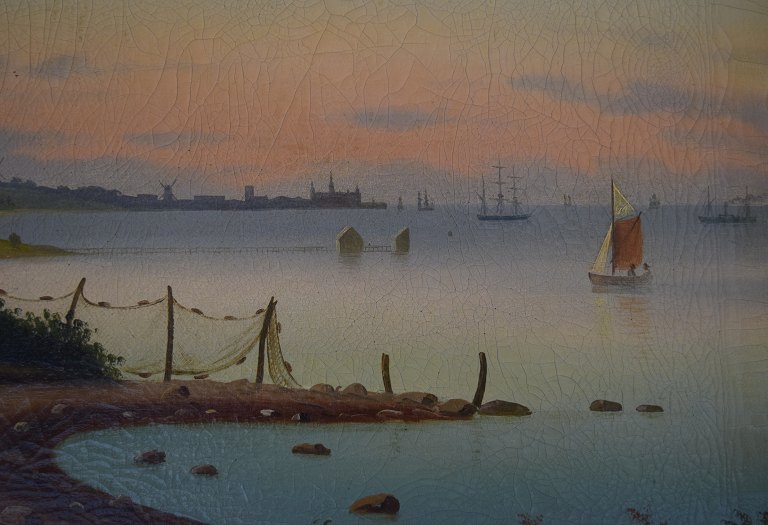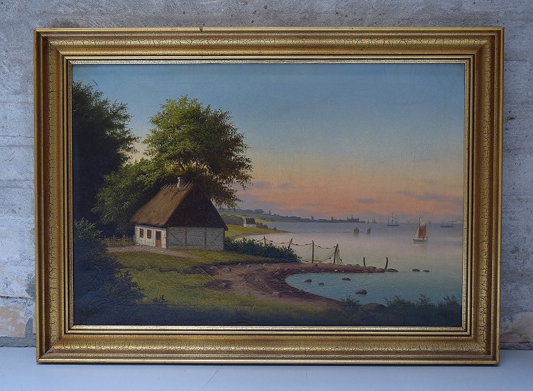 19 century Danish artist. Farmhouse with Kronborg Castle in the background in sunset. Oil on canvas. In good condition. Unsigned. Measures (ex. the frame) 60 x 42 cm. The frame measures 7 cm.