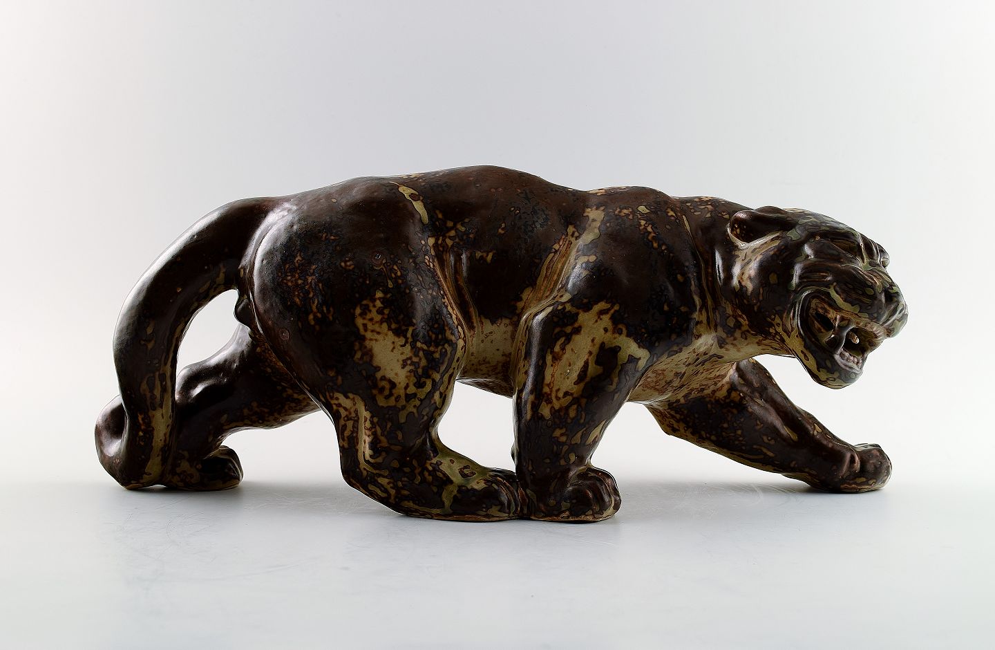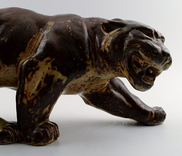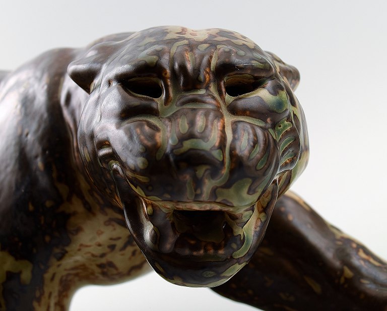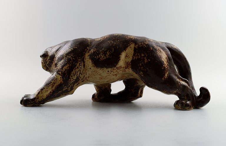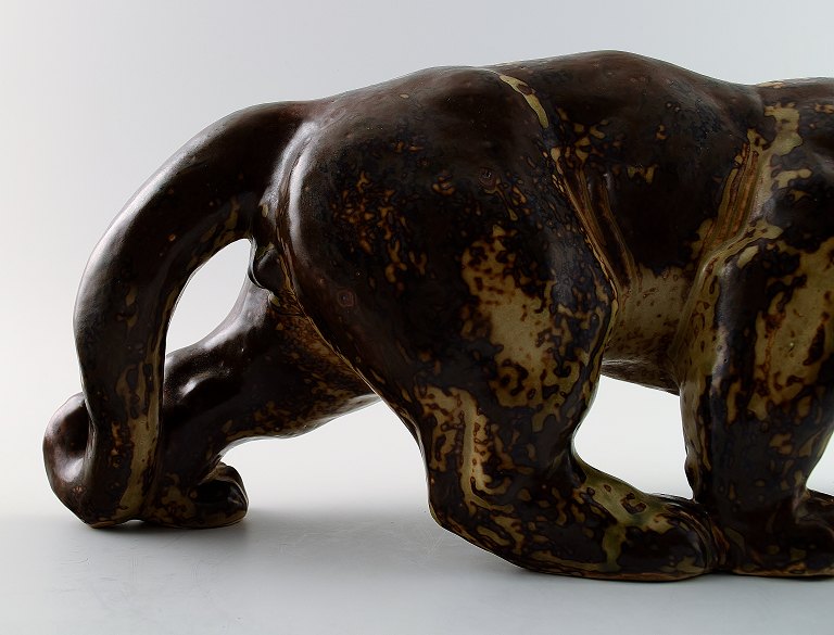 A Royal Copenhagen stoneware large figure modelled in the shape of a panther, decorated with sung glaze.