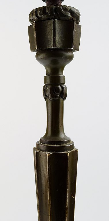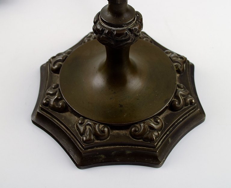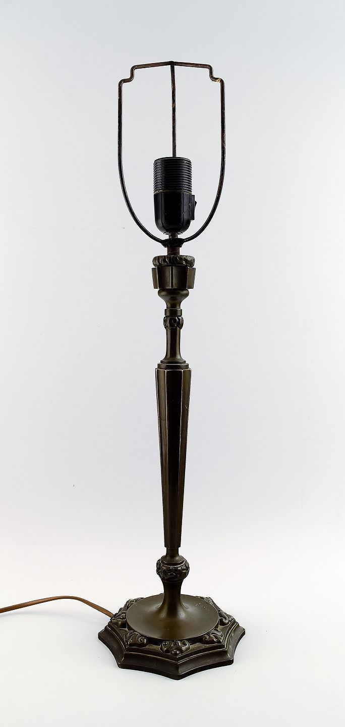 Thorvald Bindesbøll: b. Copenhagen 1846, d. 1908. Table Lamp. Patinated bronze with art nouveau ornamentation in relief on eight-sided foot. Height. incl. shade holder 63 cm.