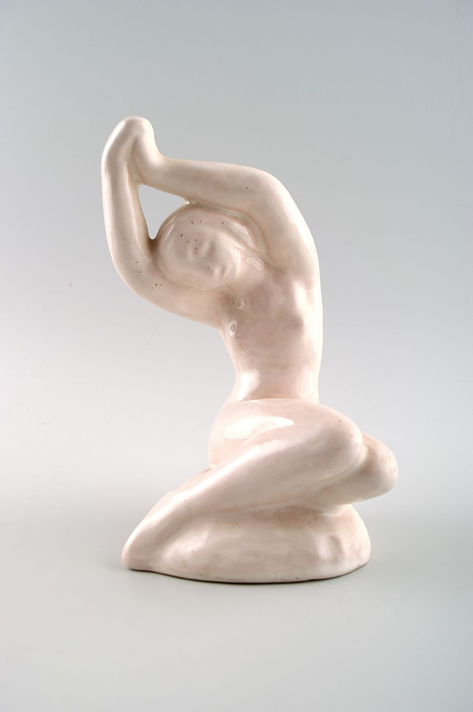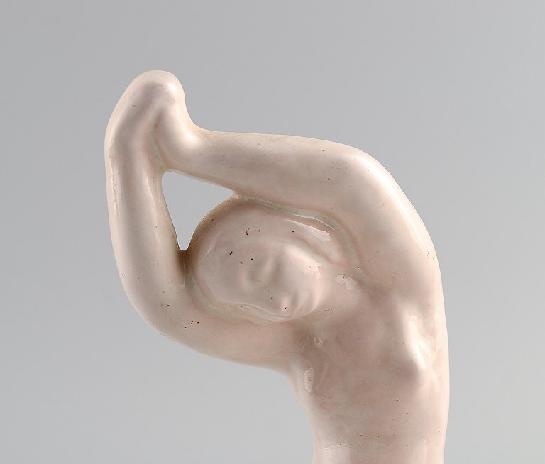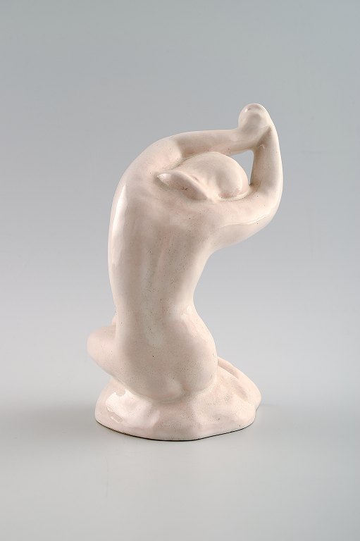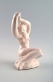 Hjorth (Bornholm, Denmark) glazed stoneware figure, naked woman by Gertrud Kudielka. Danish design. Fine white glaze. Size: 16 cm. high. 9 cm. wide. Signed Hjorth.