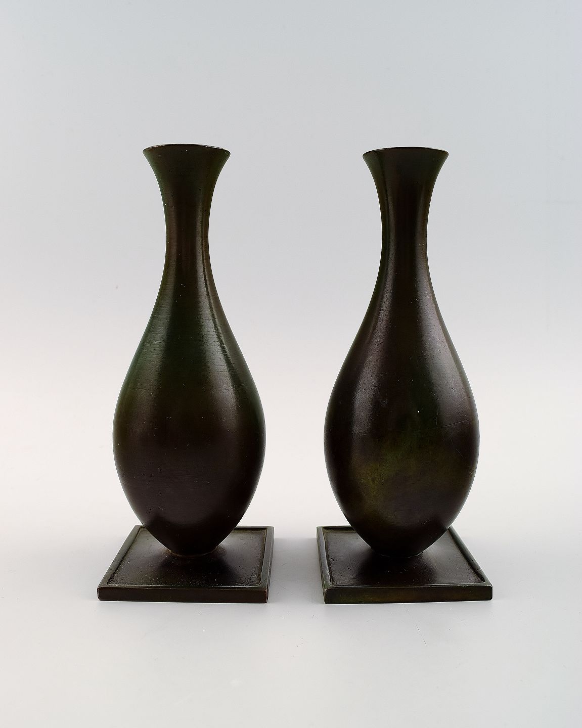 Et par svenske GAB (Guldsmedsaktiebolaget) Art deco vaser, bronze. 1930/40´erne. Måler 18 cm. x 7 cm. I flot stand, smuk patina.