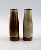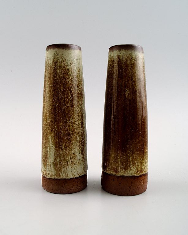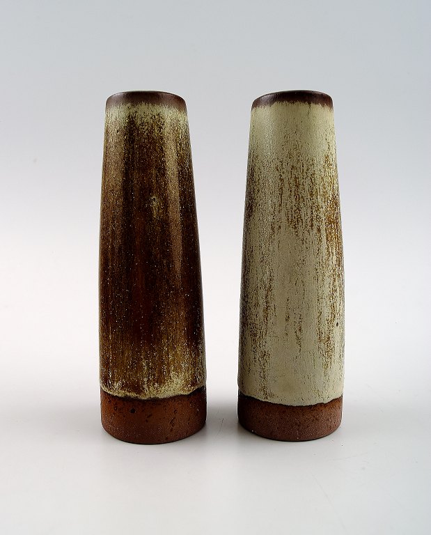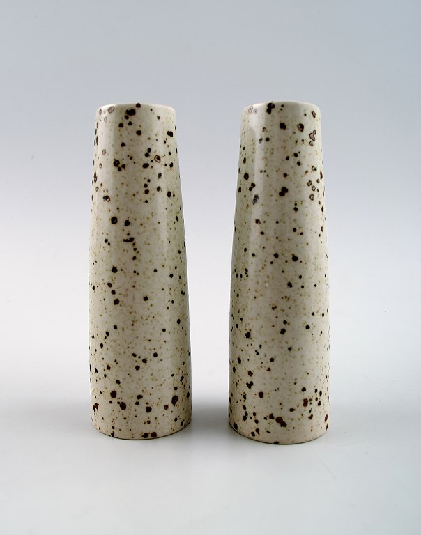 Per Linnemann-Schmidt for Palshus b. Copenhagen 1912, d. 1999. Four vases in stoneware decorated with speckled glazes in green brown and gray tones. Signed Palshus and PLS. In perfect condition. Height 11 cm.