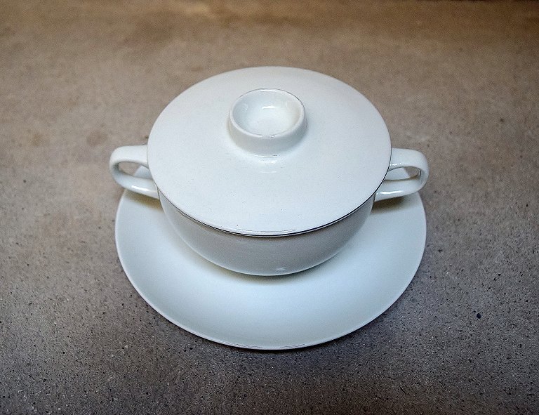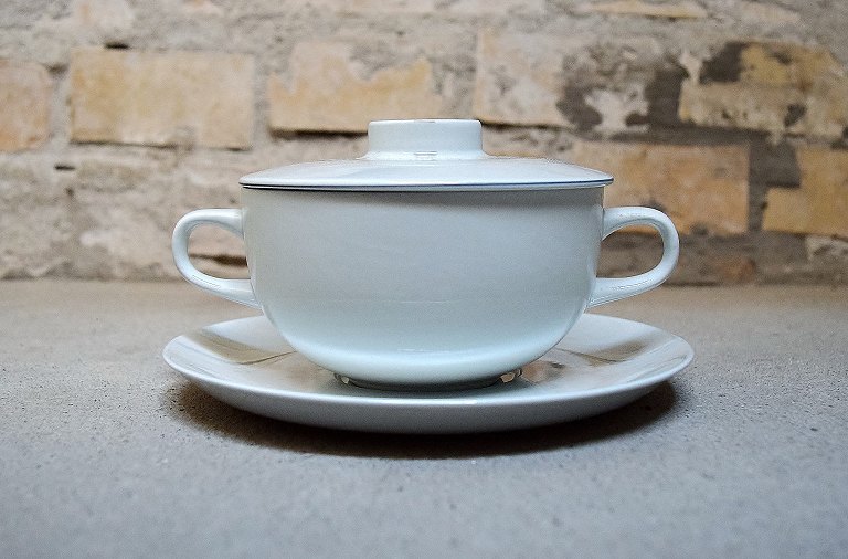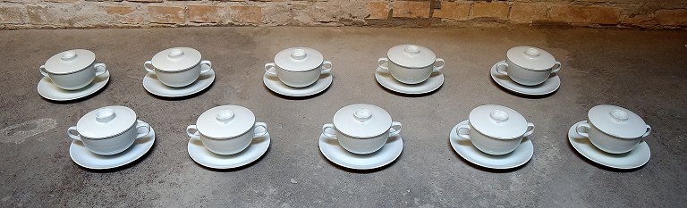 Aluminia blue line, earthenware/faience. 10 bouillon cups with lids and saucers. In perfect condition, 1st. factory quality. Measures 16 x 9 cm. Saucer 17 cm.