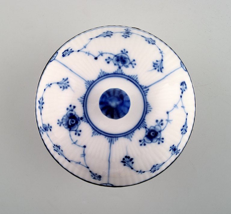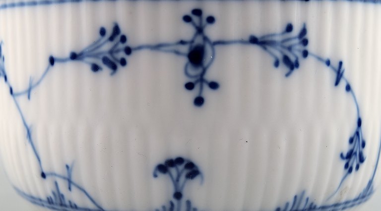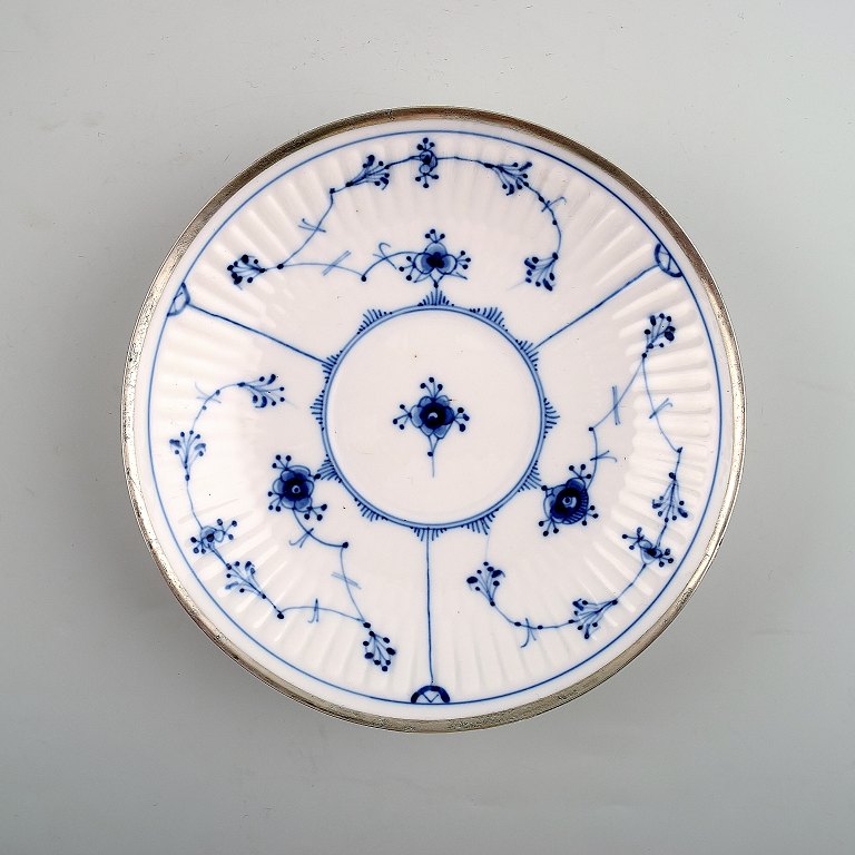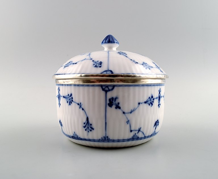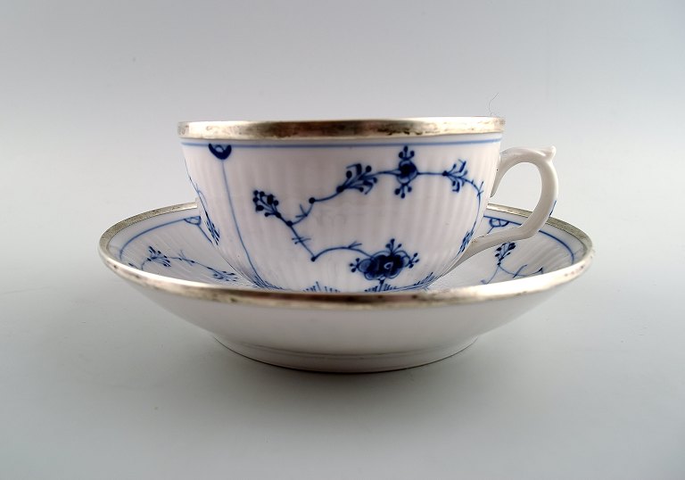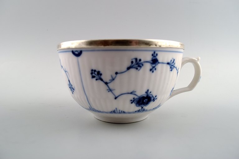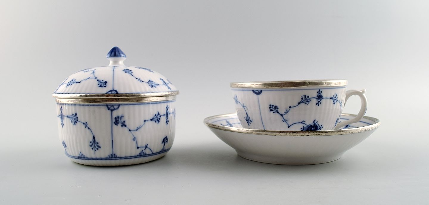Sjælden og antik, tidligt 1800-tallet Royal Copenhagen Musselmalet riflet stor morgenkop med hank, underkop og sukkerskål, alle dele med sølvmontering.