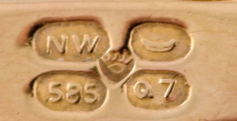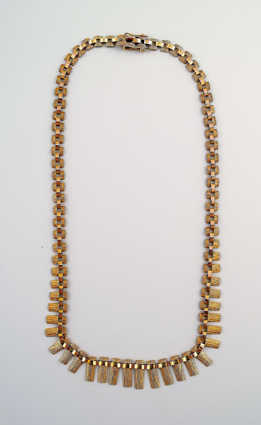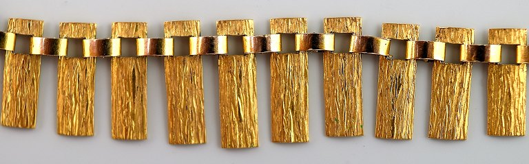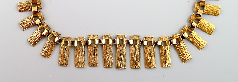 HALSKÆDE, finsk design. 14 karat guld. Westerback, Helsinki, 1969. Bredde fra 5,5 til 14 mm. Længde 42 cm. Vægt ca. 13 gram. I perfekt stand. Stemplet.