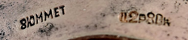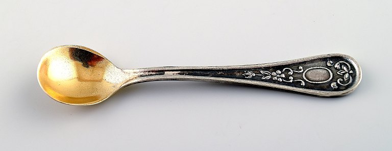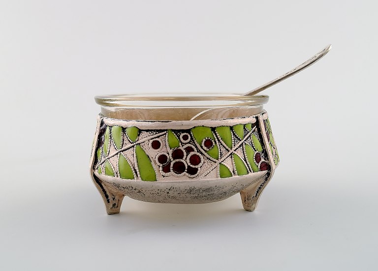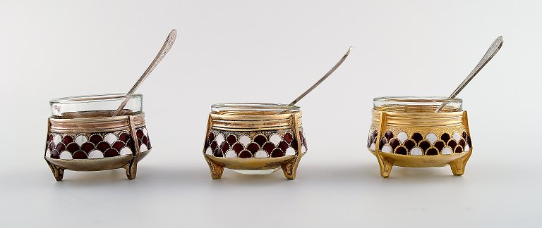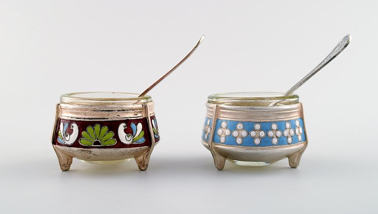 6 russiske saltkar med emalje arbejde i forskellige farver, glasindsats, tilhørende russisk saltske i sølv ca. 1900.