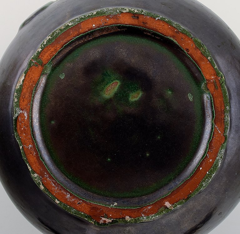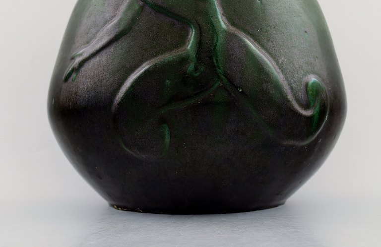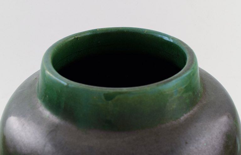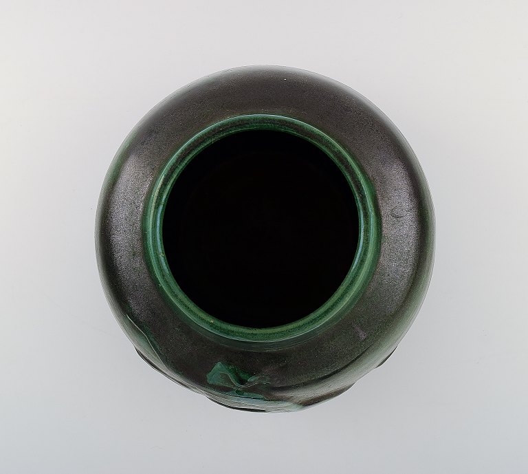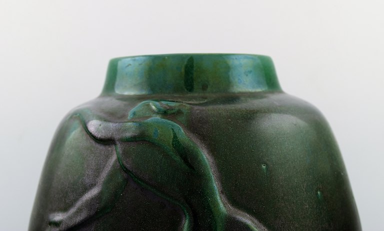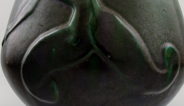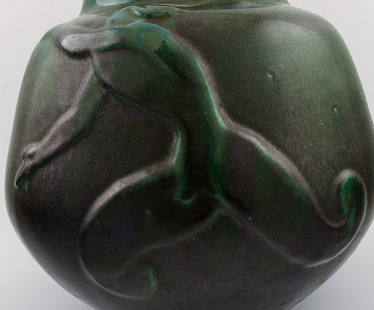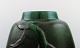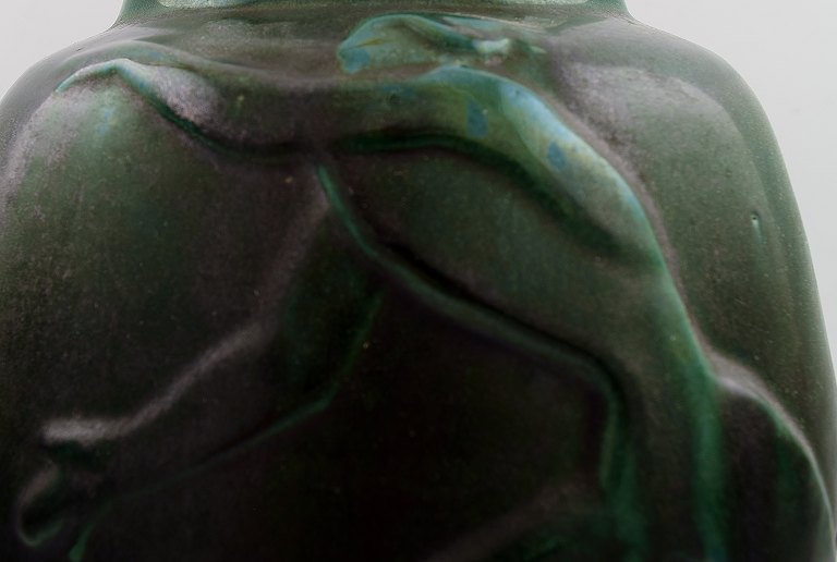 Motala lervarufabrik, Sverige, 1940´erne. Stor Art deco keramikvase. Smuk grøn glasur, kvinde i relief. Måler: 24 cm. x 21 cm. I perfekt stand.