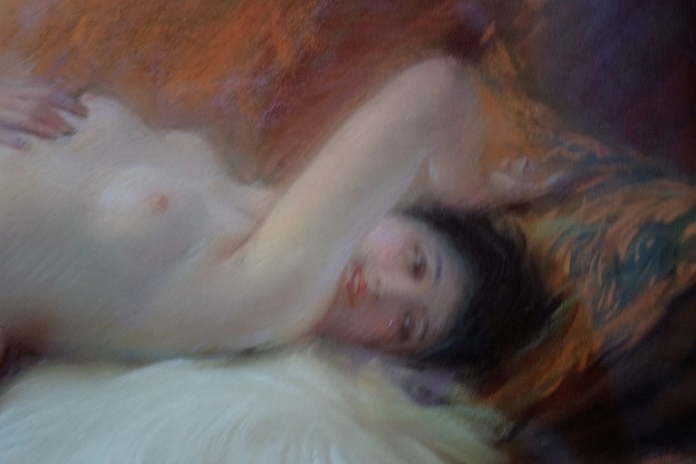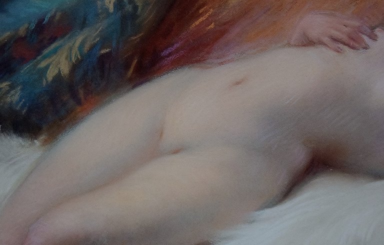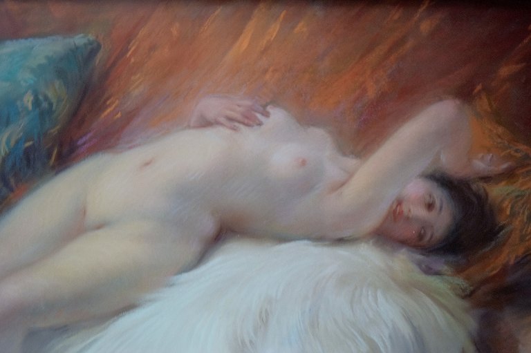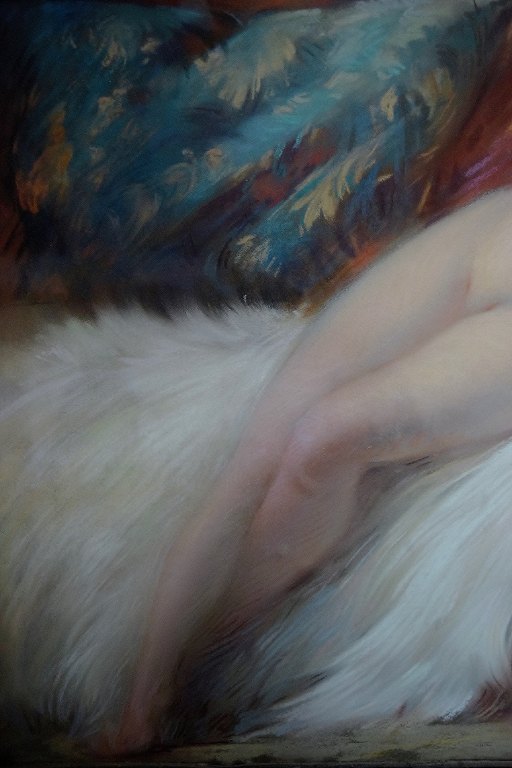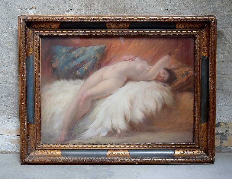 Henslængt nøgen kvinde på lammeskind, fransk Art Deco, pastel. Utydeligt signeret, dateret 1925, fransk kunstner. I flot stand. Måler : 63 x 44 cm. Den smukke Art Deco ramme måler 9 cm.