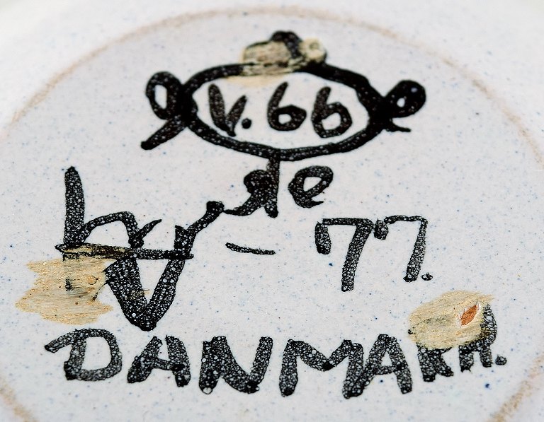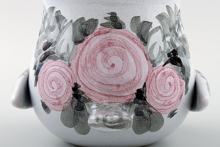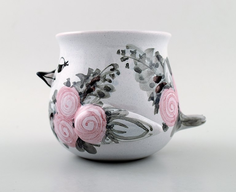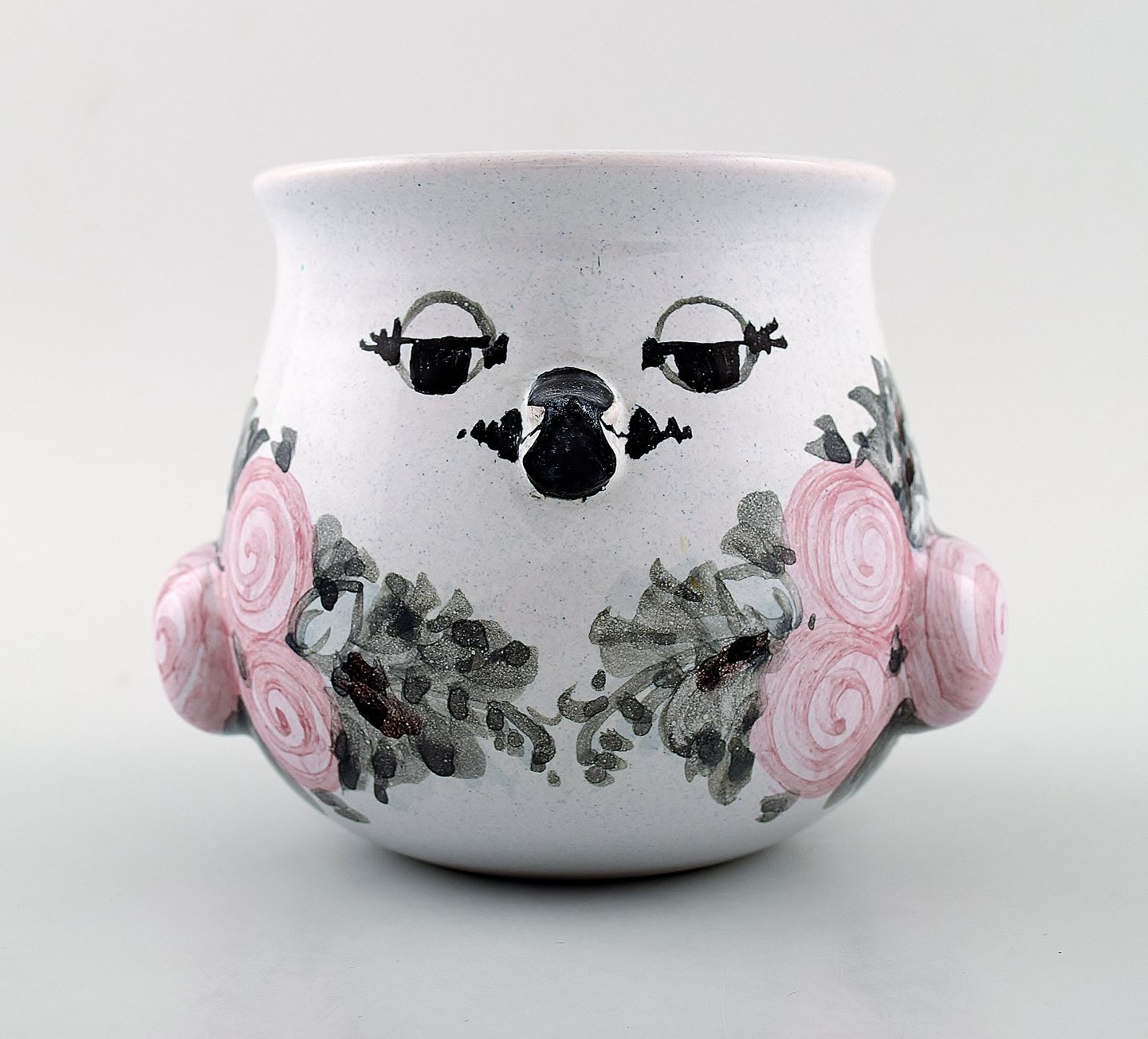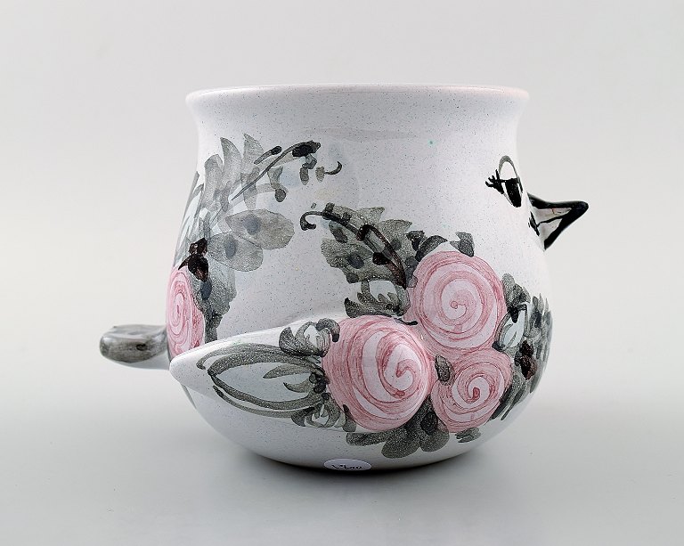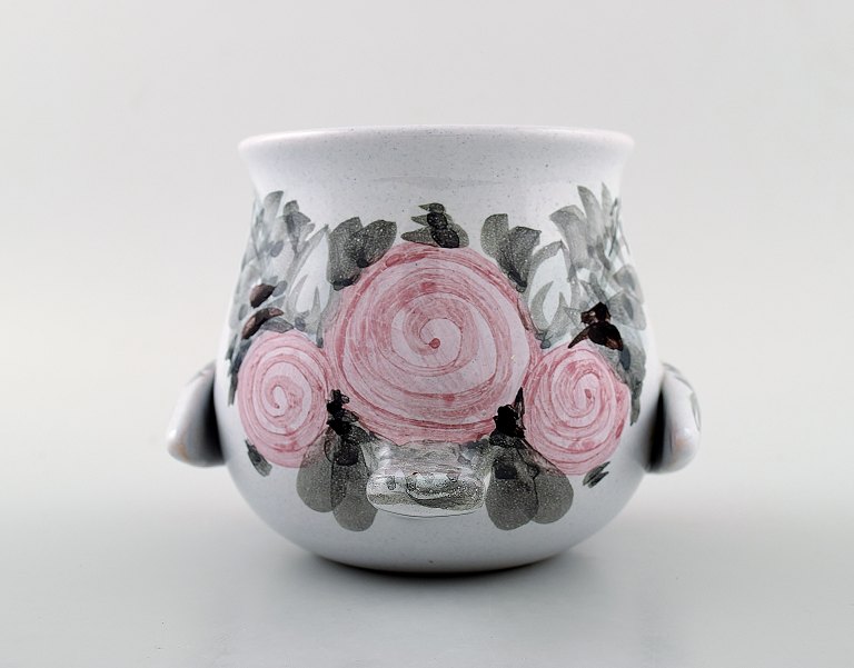 Bjørn Wiinblad unika keramik vase/urtepotteskjuler, lyserød og grå glasur. Måler: 11 cm. x 11 cm. Modelnummer v.66. Dateret 1977. I perfekt stand.