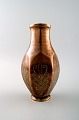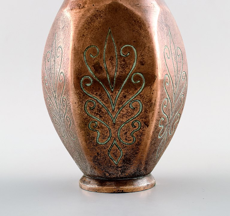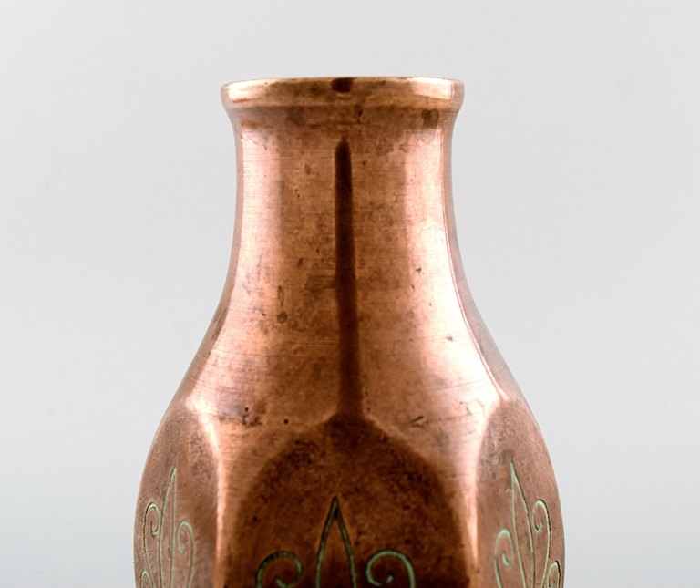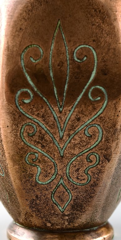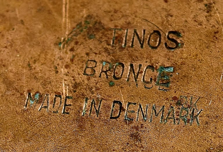 A pair of art deco Tinos Bronze vases in massive patinated bronze molded with foliage. Marked Tinos, bronze, Made in Denmark. 1930 s. Measures 16.5 x 9 cm. In excellent condition, beautiful patina.