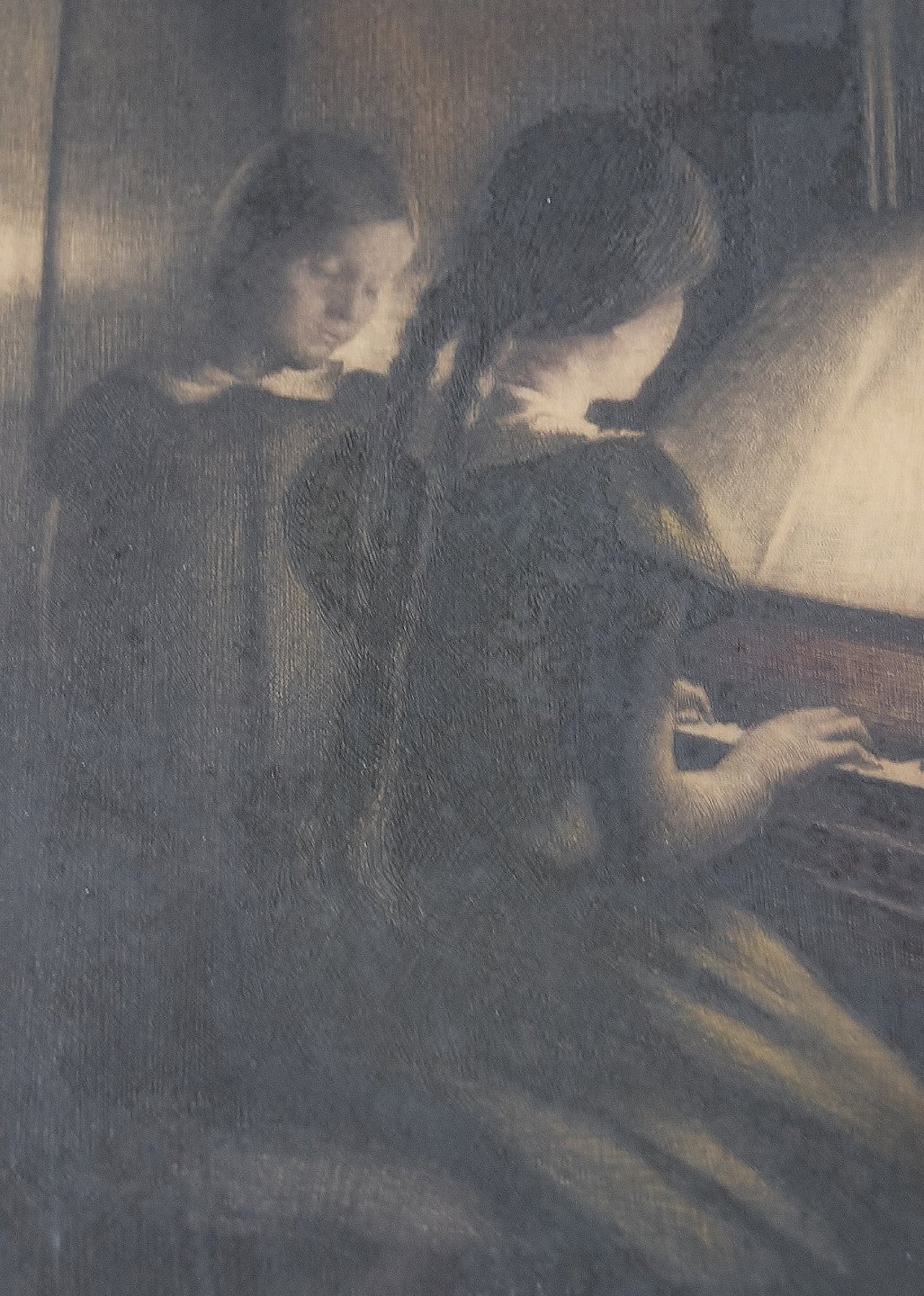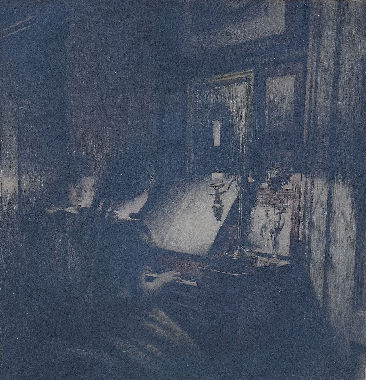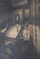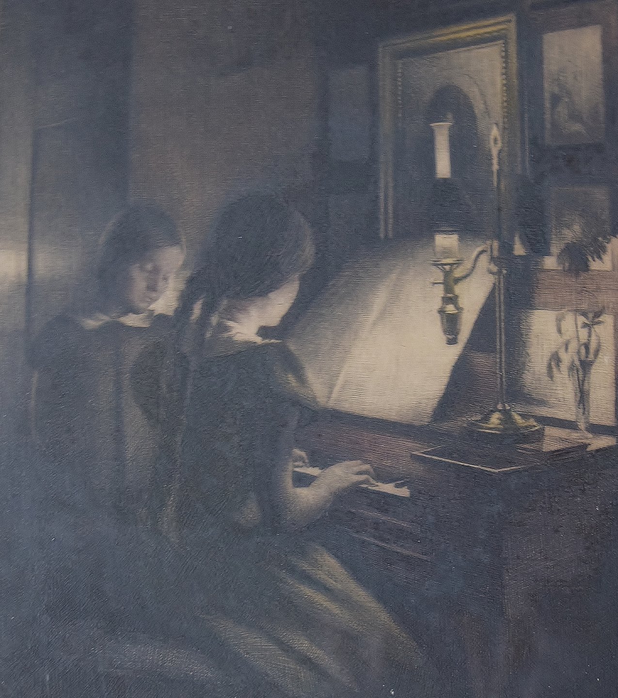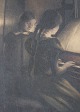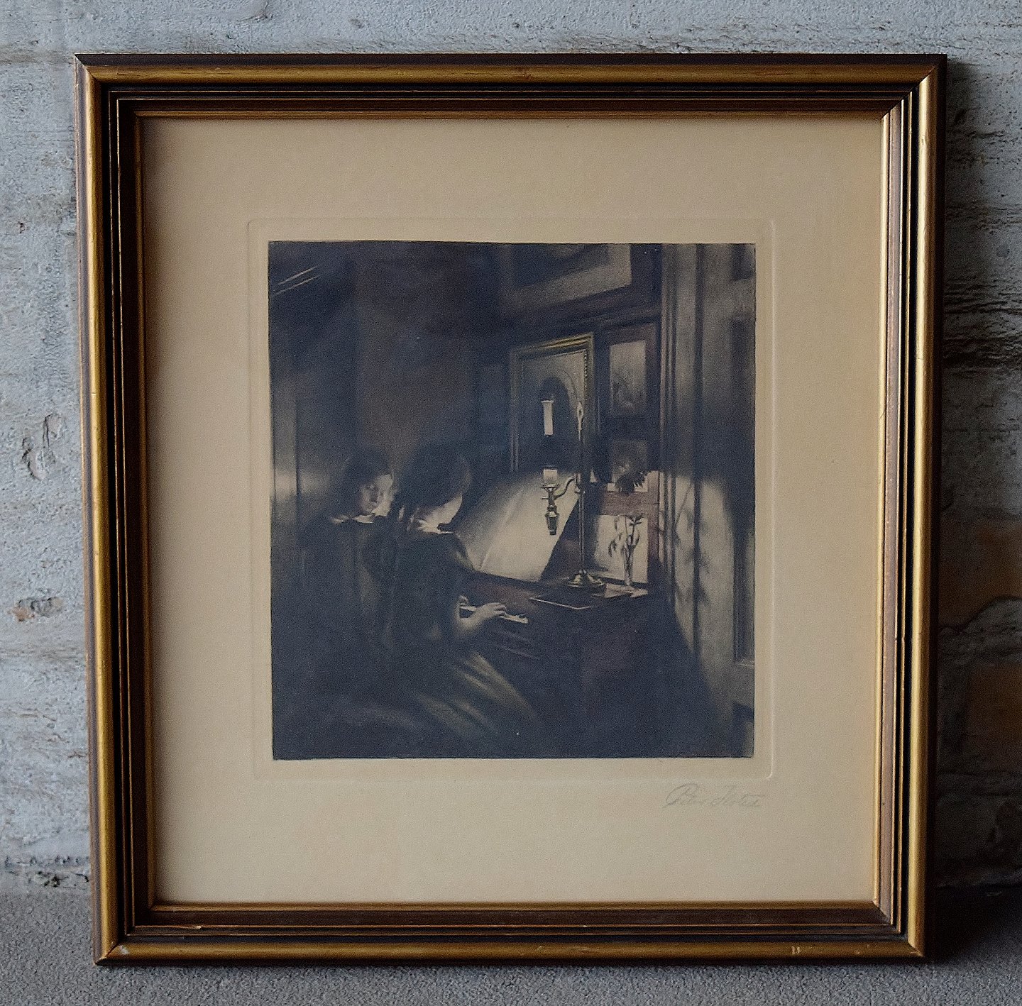 Peter Ilsted: Interior with two girls at the piano. Signed Peter Ilsted. Mezzotint in colours. Plate size 23.5 x 21.5 cm. In good condition.