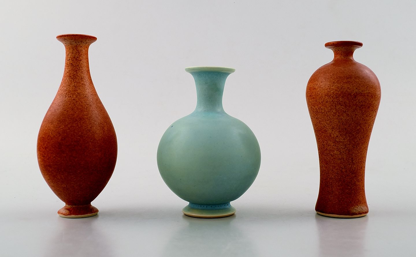 3 unique miniature ceramic vases by Per Liljegren. Signed. In perfect condition. Swedish design 1980s. Beautiful glazes. Height 10 cm. (Highest vase)