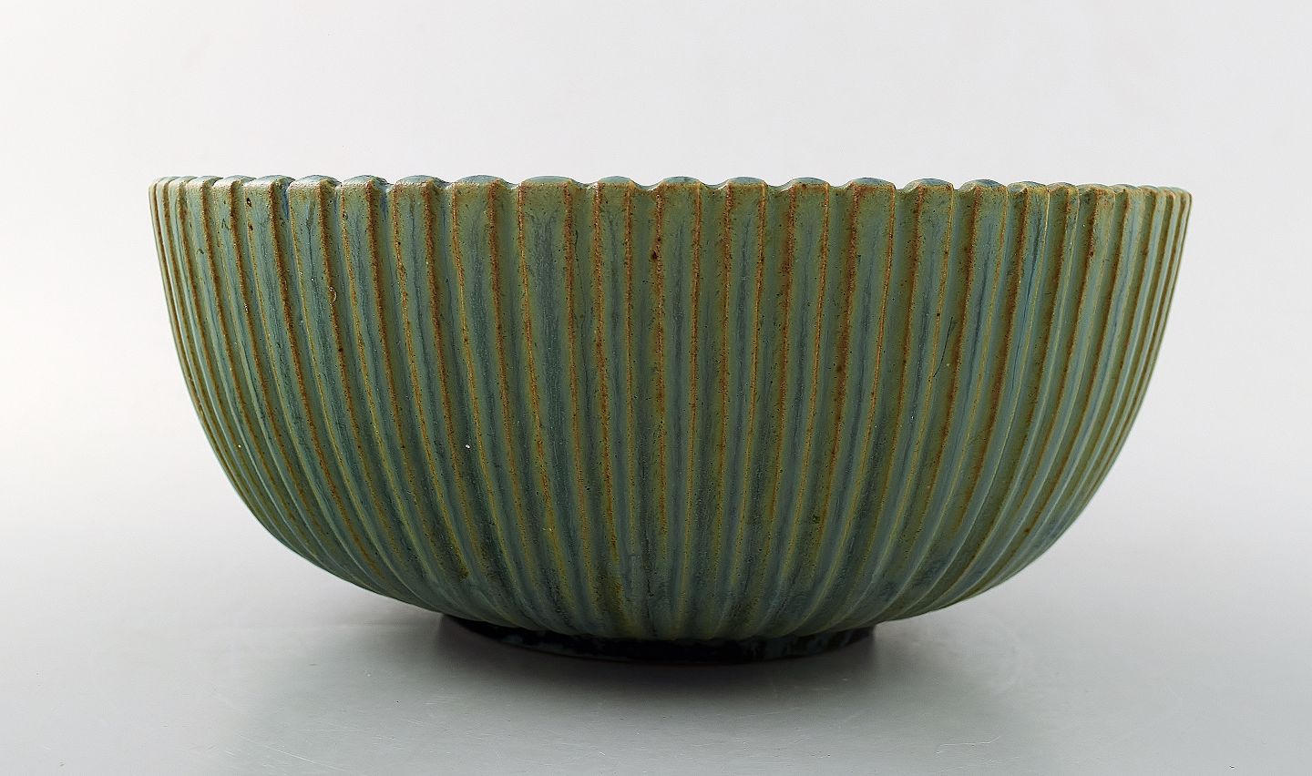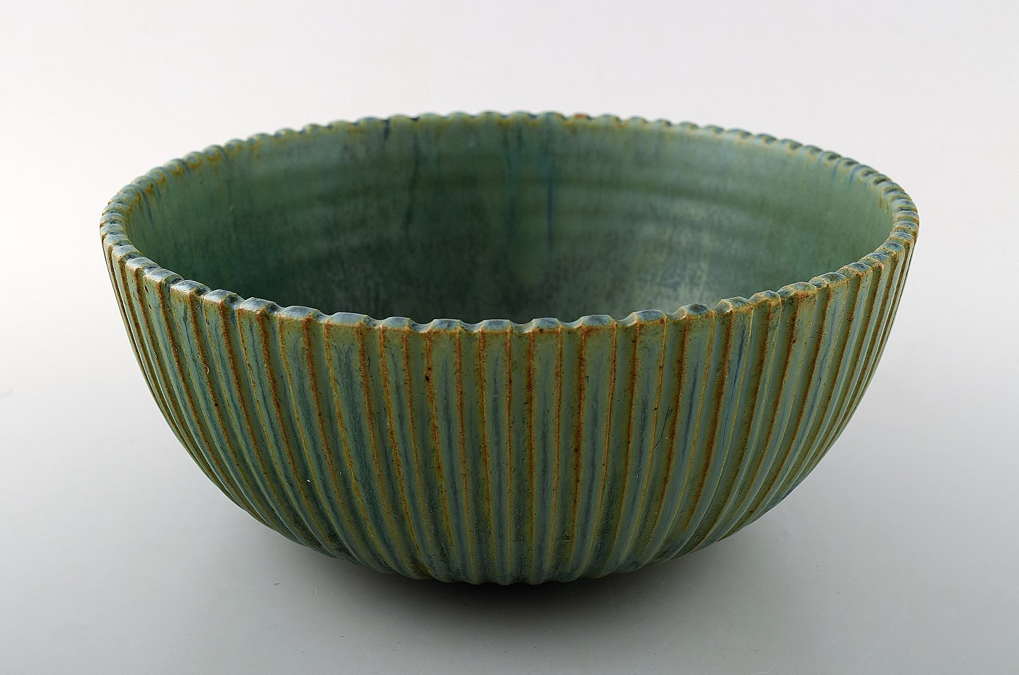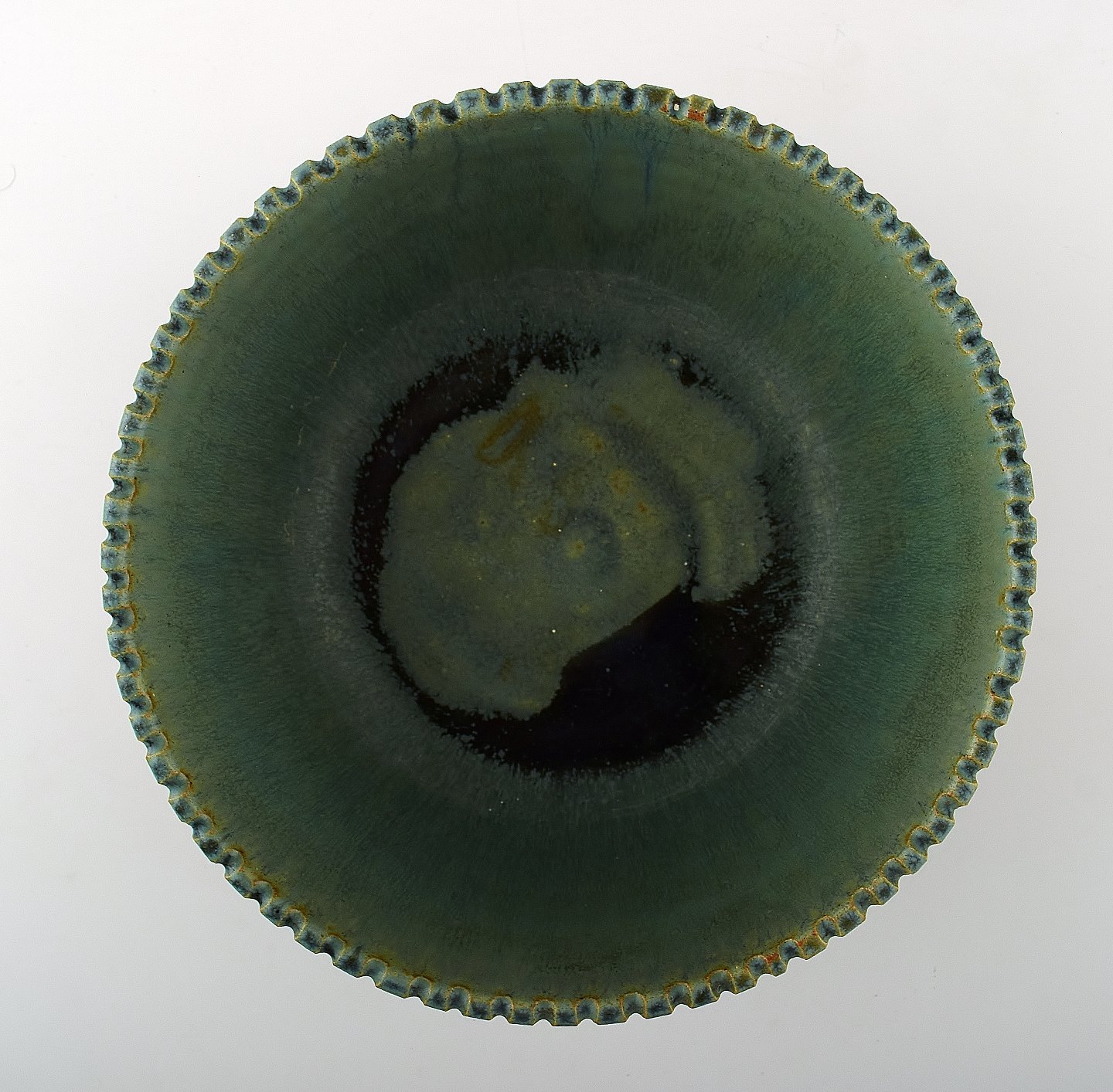 Arne Bang. Keramikskål. Stemplet AB 122. Flot glasur i grønblå nuancer. I flot stand. Højde: 10 cm. Diameter : 22 cm.