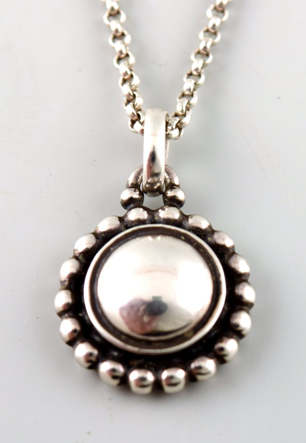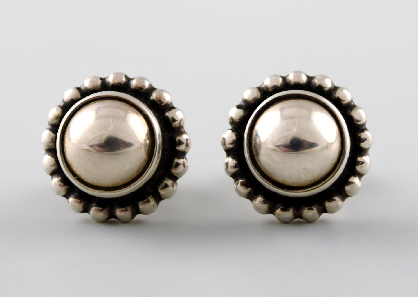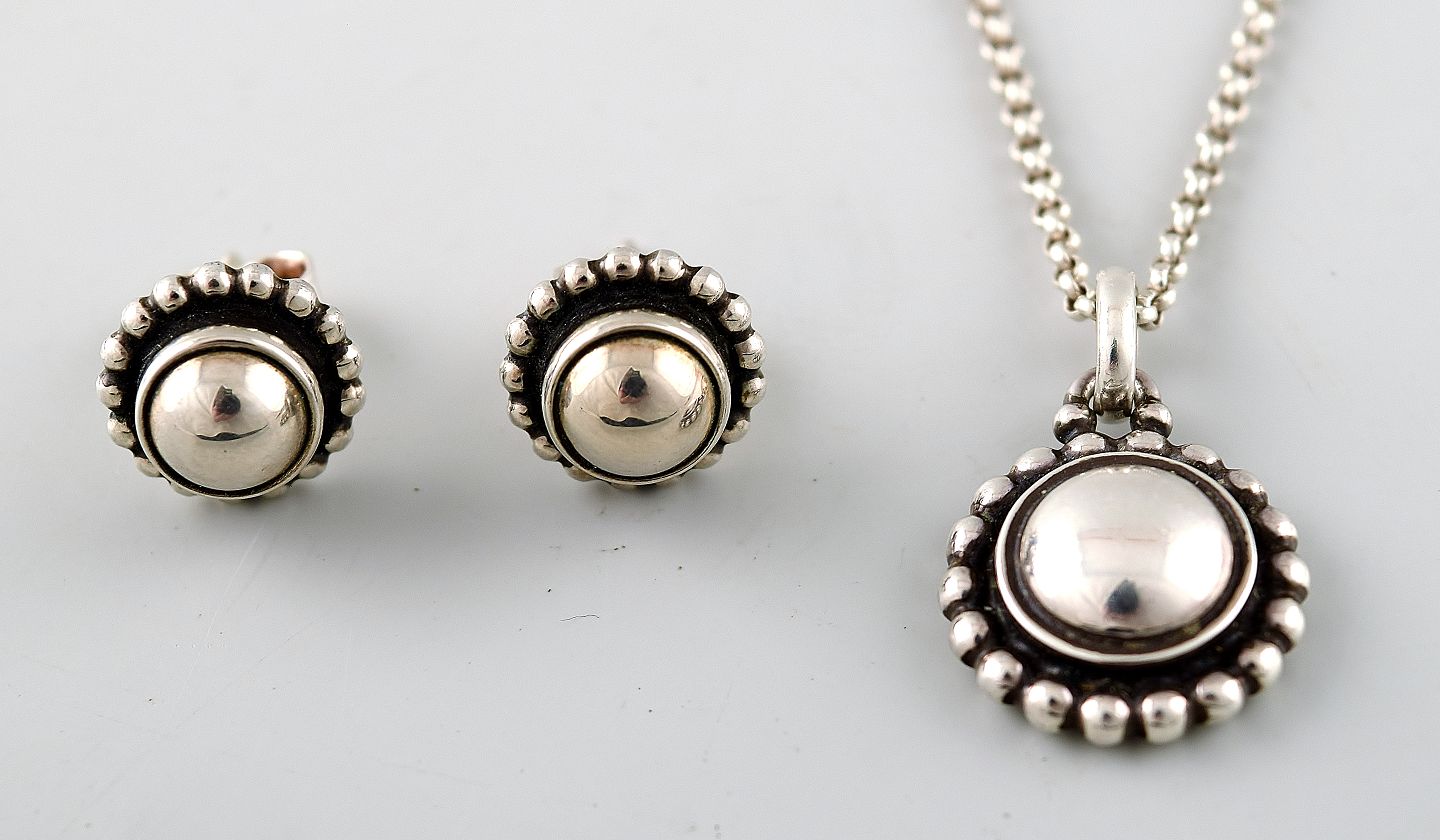 Georg Jensen. Moonlight Blossom, Halssmykke samt ørestikkere af oxyderet sterlingsølv. Dessin nr. 9A og 9B.