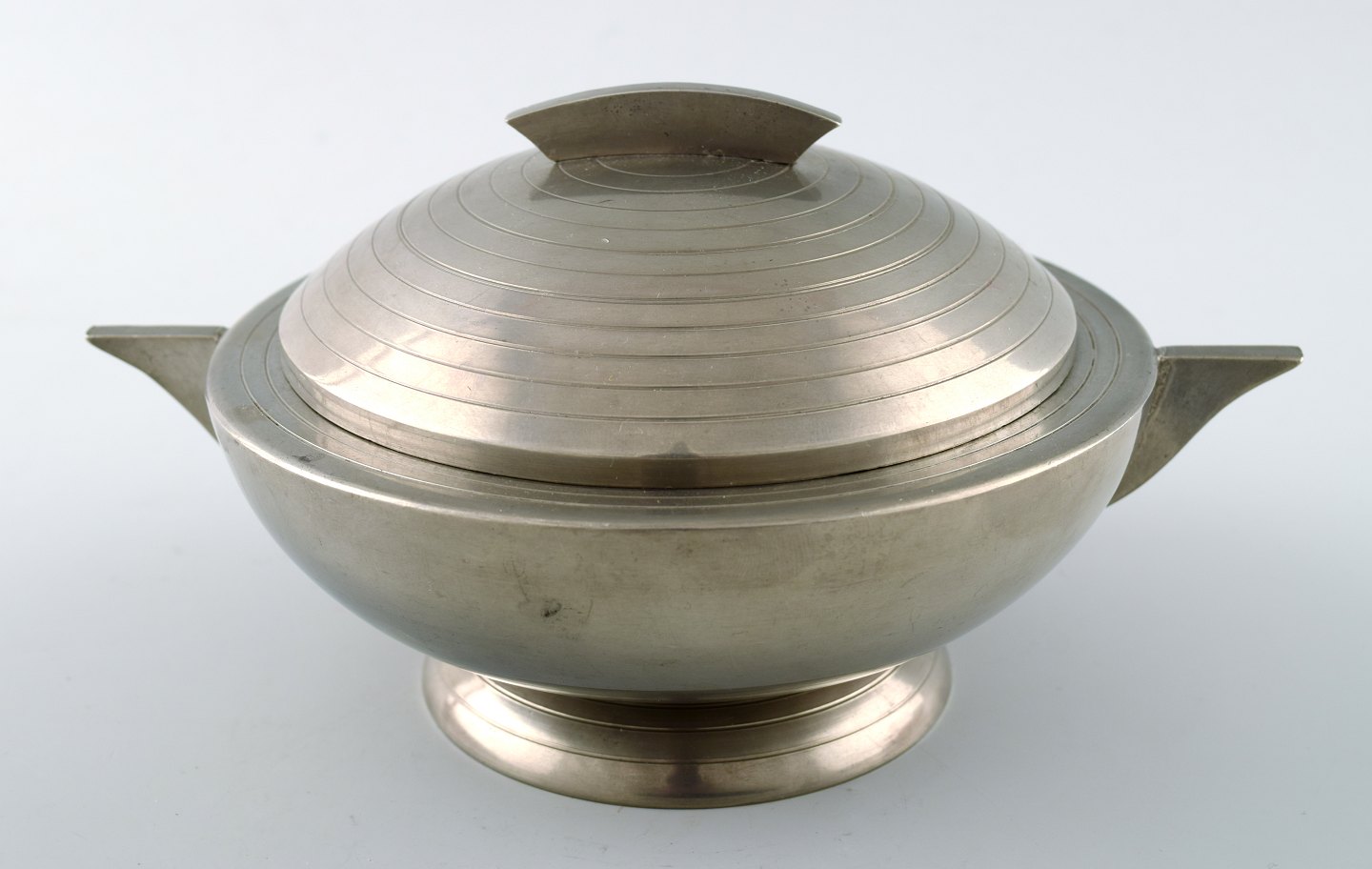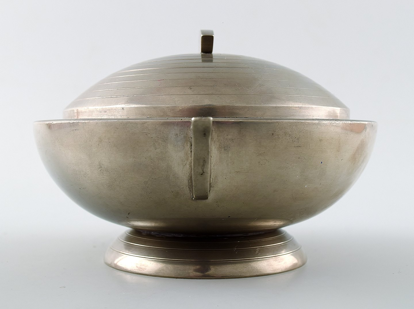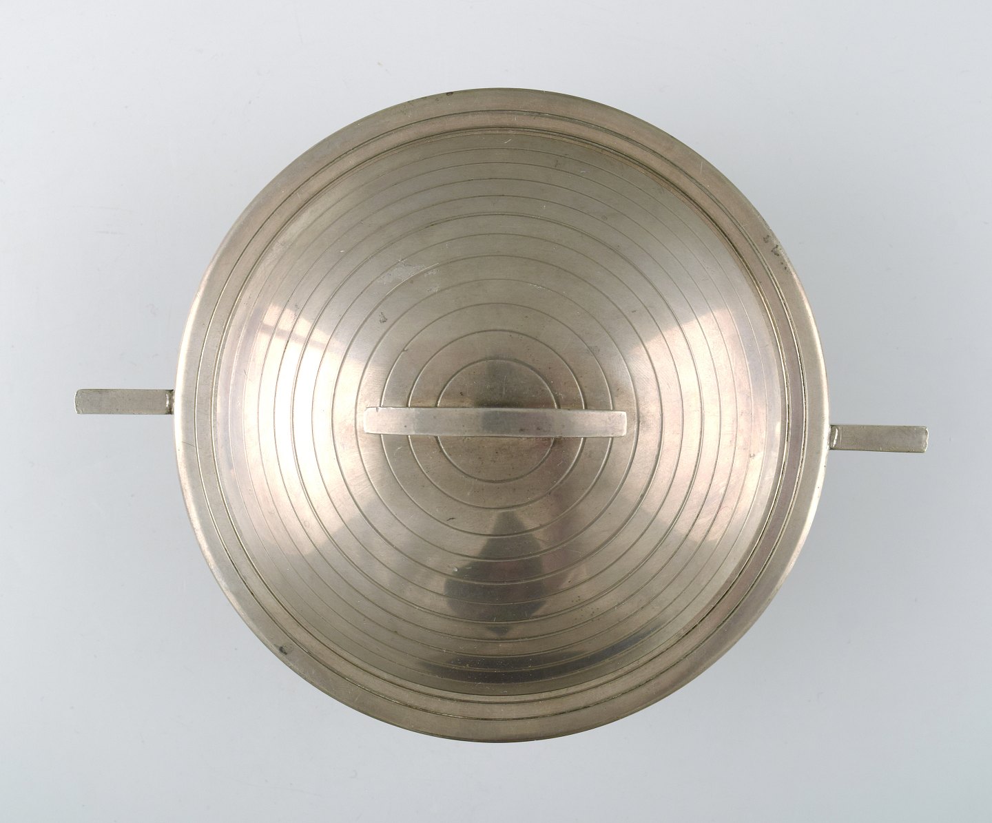 GAB (Guldsmedsaktiebolaget) Art deco lidded bowl in pewter. Sweden, 1940s. Measures 20 x 10 cm. Marked. In very good condition.