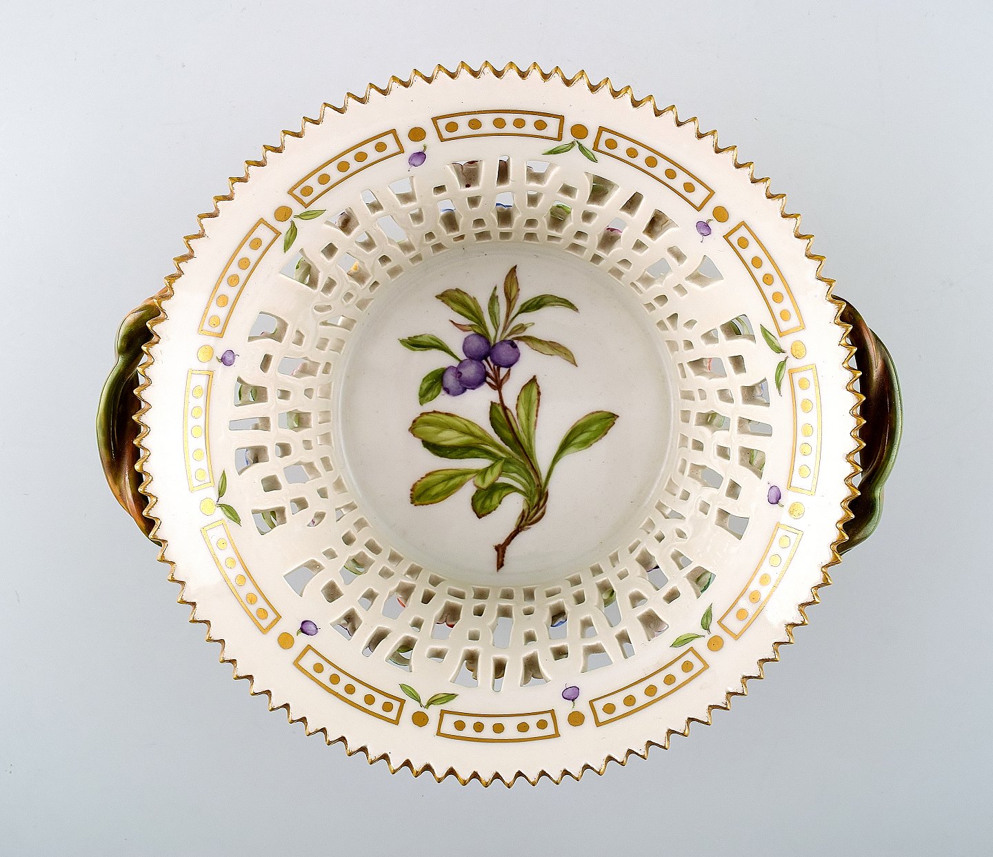 Royal Copenhagen Flora Danica Fruit Bowl number 20/3532. Measures 21.5 cm. x 9.5 cm. In perfect condition. Factory 1st. Latin name "Arbutus Alpina L.