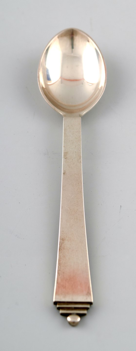 12 Georg Jensen Pyramid coffee spoons in original box. Designed by Harald Nielsen 1933-44. In perfect condition. Measures 10.5 cm.