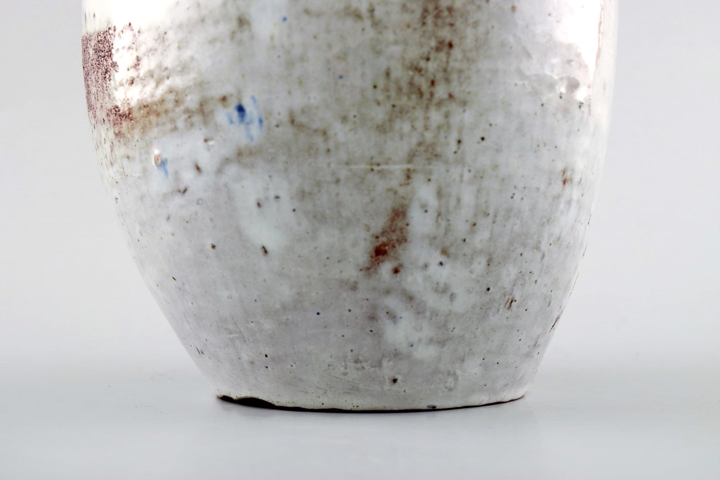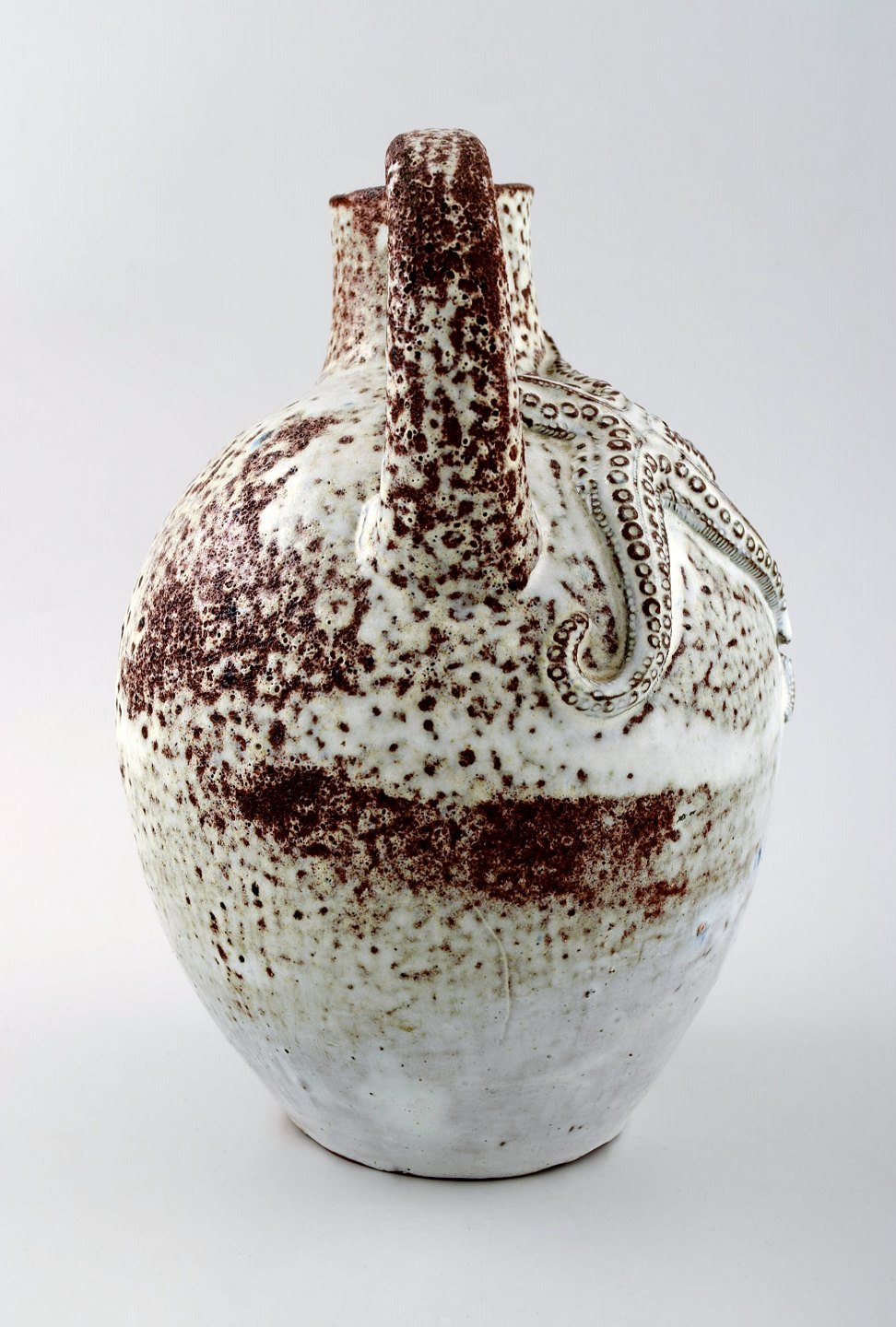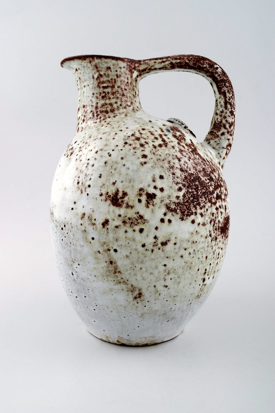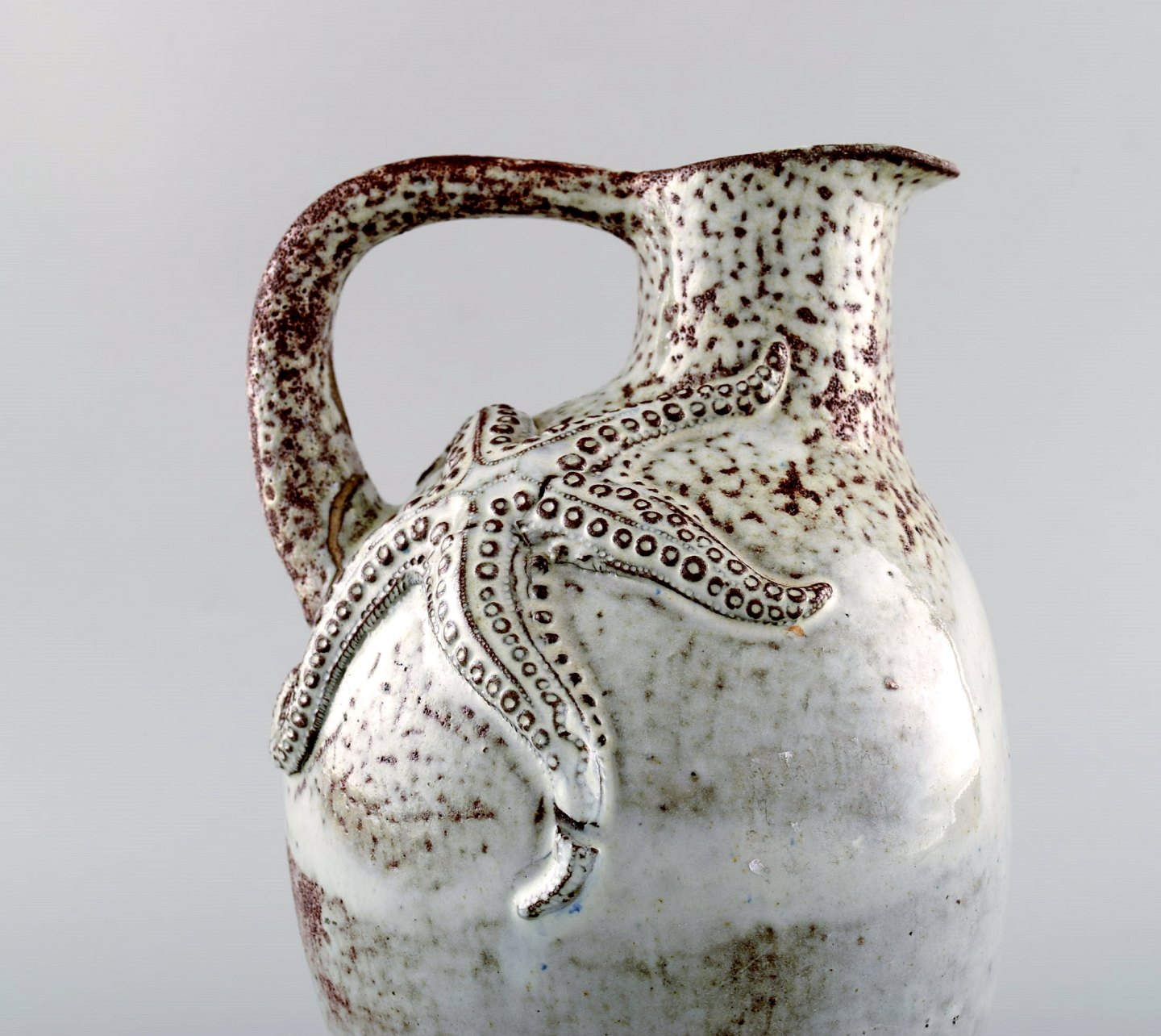 Kande af hvidglaseret stentøj udført af Gertrud Vasegaard (1913-2007), modelleret med søstjerne på siden, 1933-35.