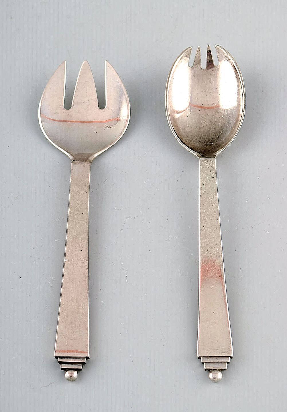 Georg Jensen Pyramide salatsæt i hel sølv. Designet af Harald Nielsen 1933-44. Tidligt stempel. I perfekt stand. Måler 14 cm.