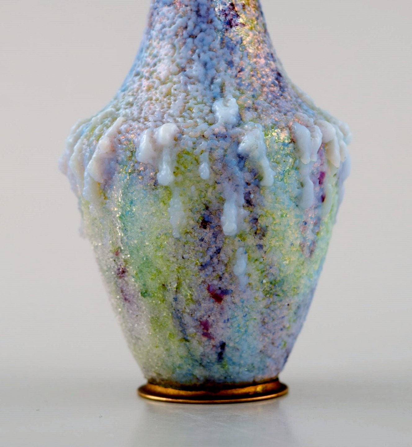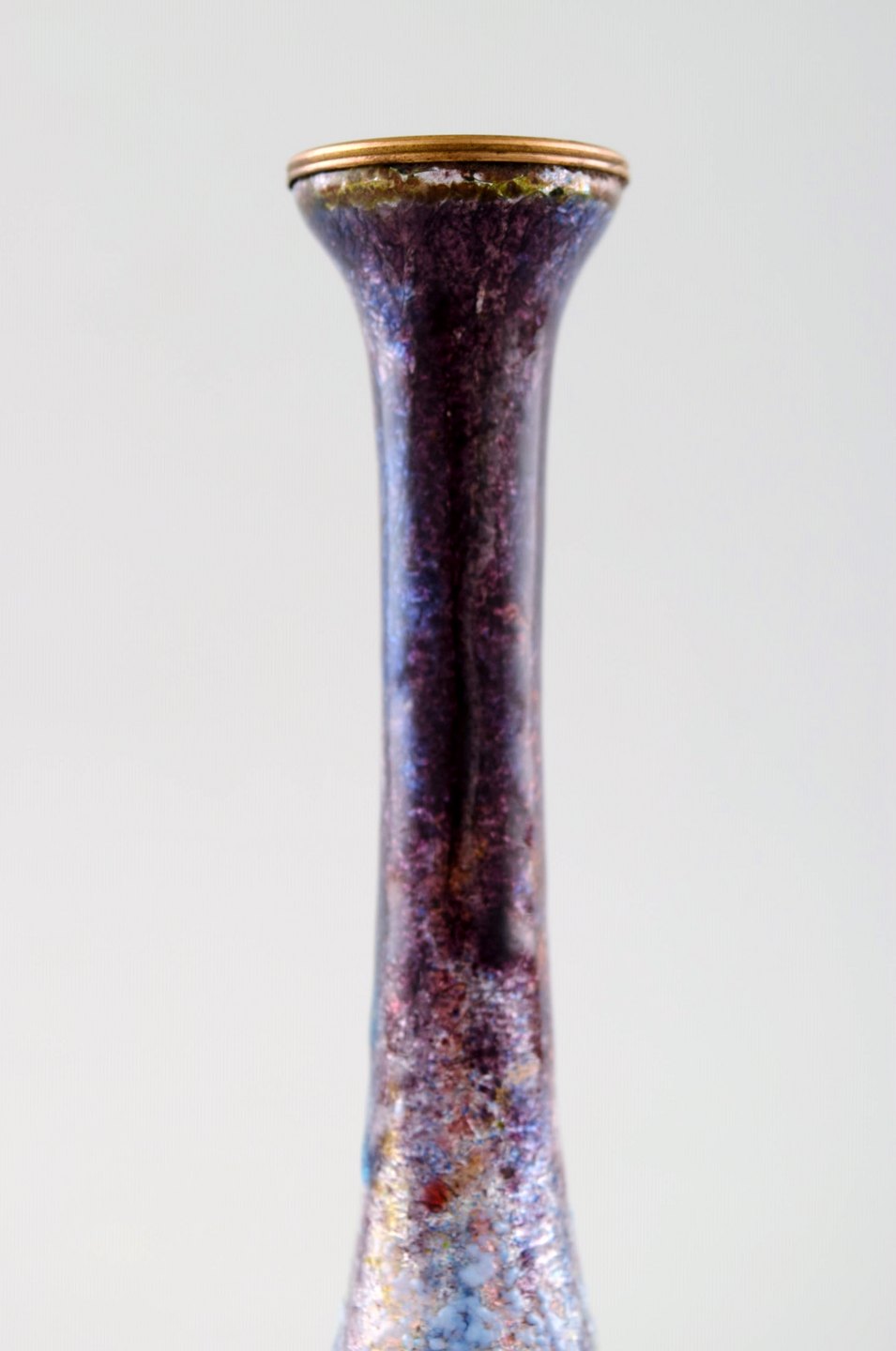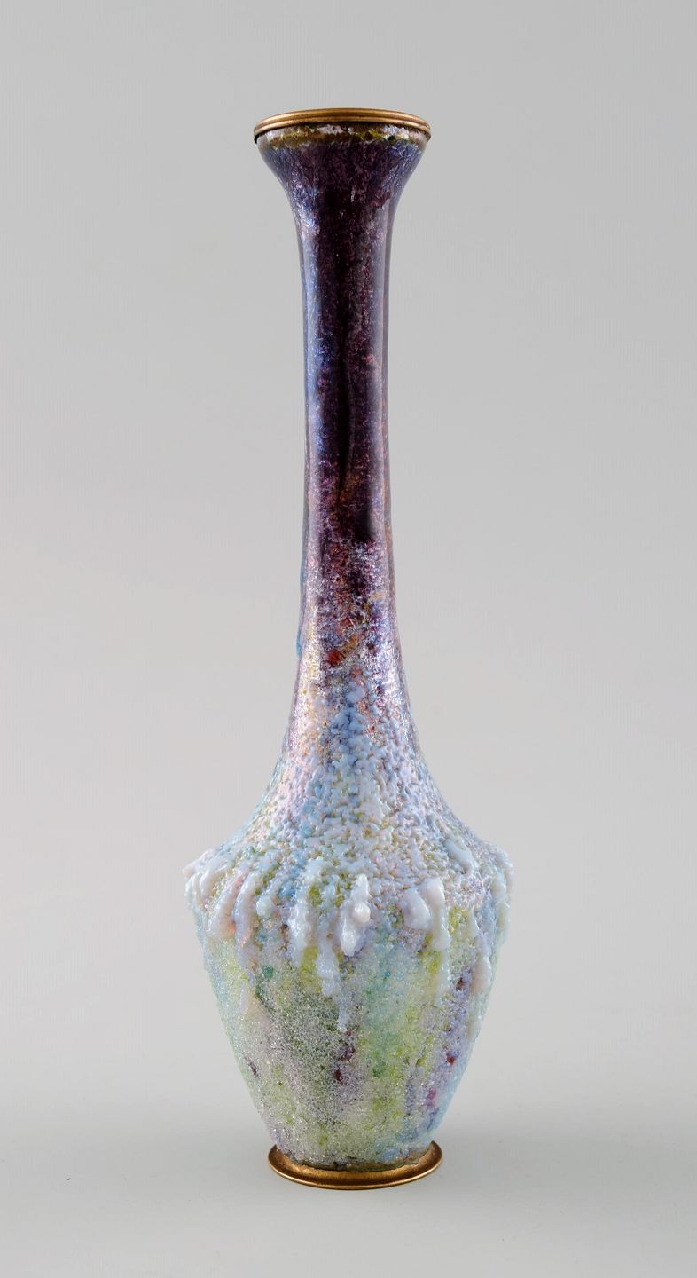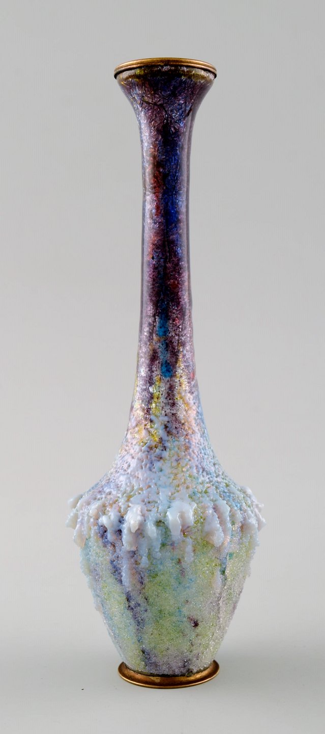 Art nouveau Limoges vase, Frankrig. Emalje på messing, flot glasur i mange nuancer. Usigneret. Circa 1910. En fremragende art nouveau vase i fantastisk kvalitet. I perfekt stand. Måler: 16 cm.