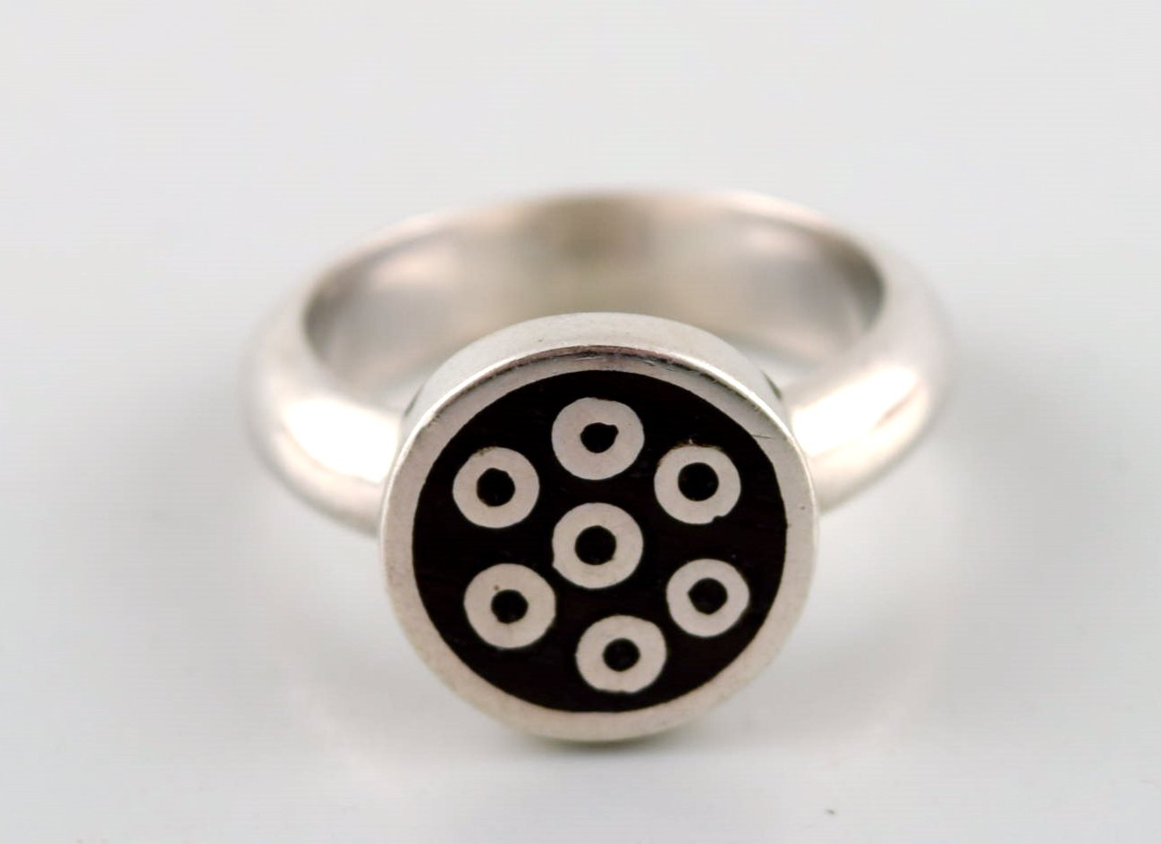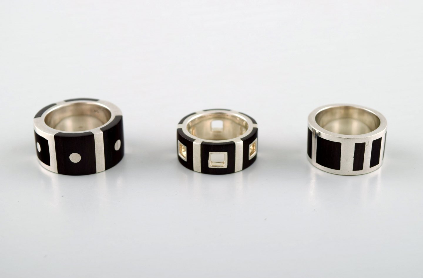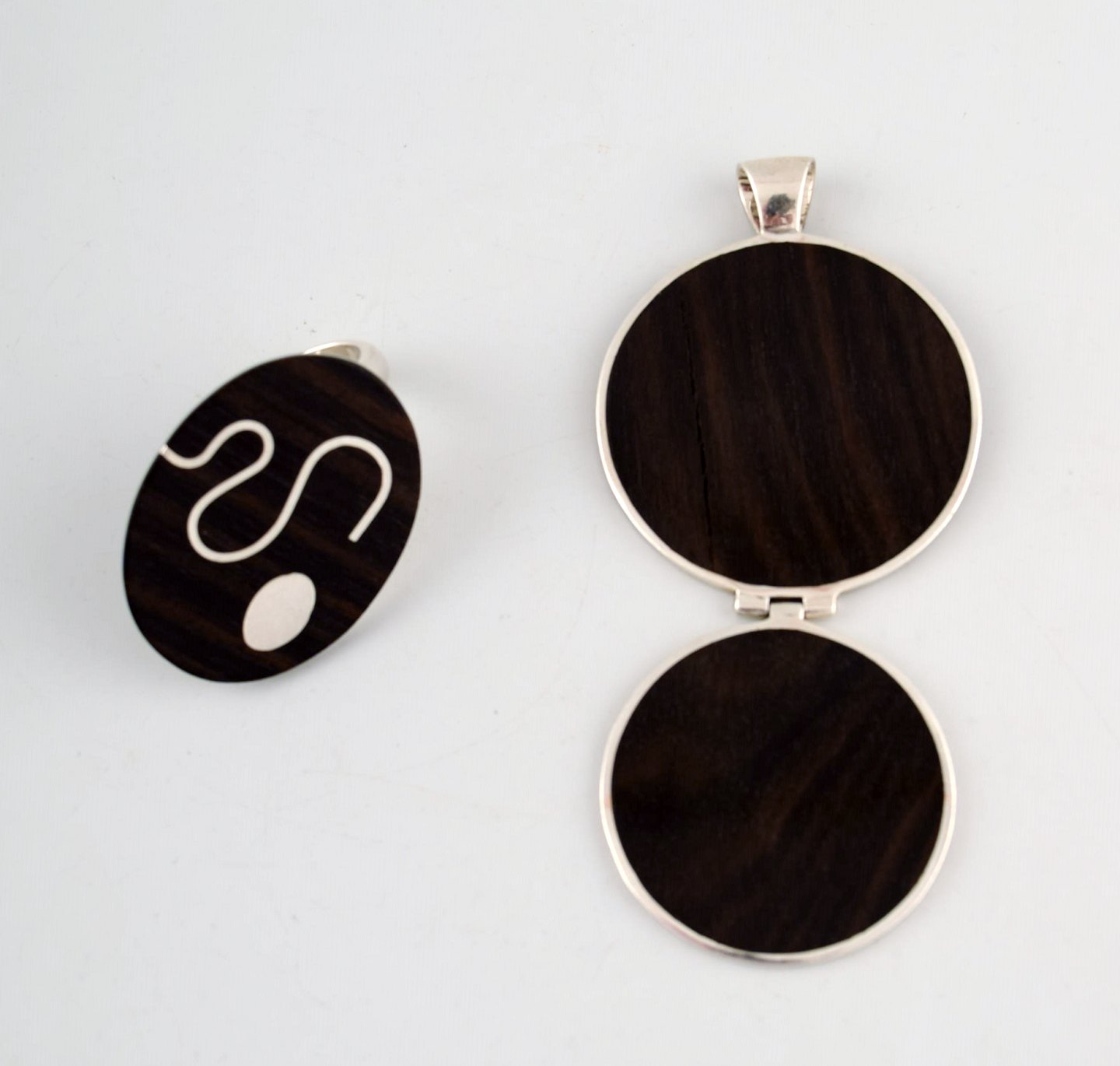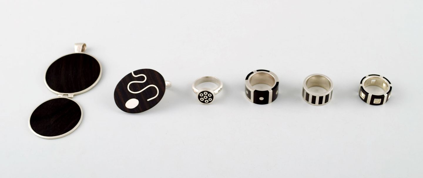 Samling smykker af sterlingsølv, de fleste med monteringer af ibenholt, bestående af 5 ringe og et vedhæng.