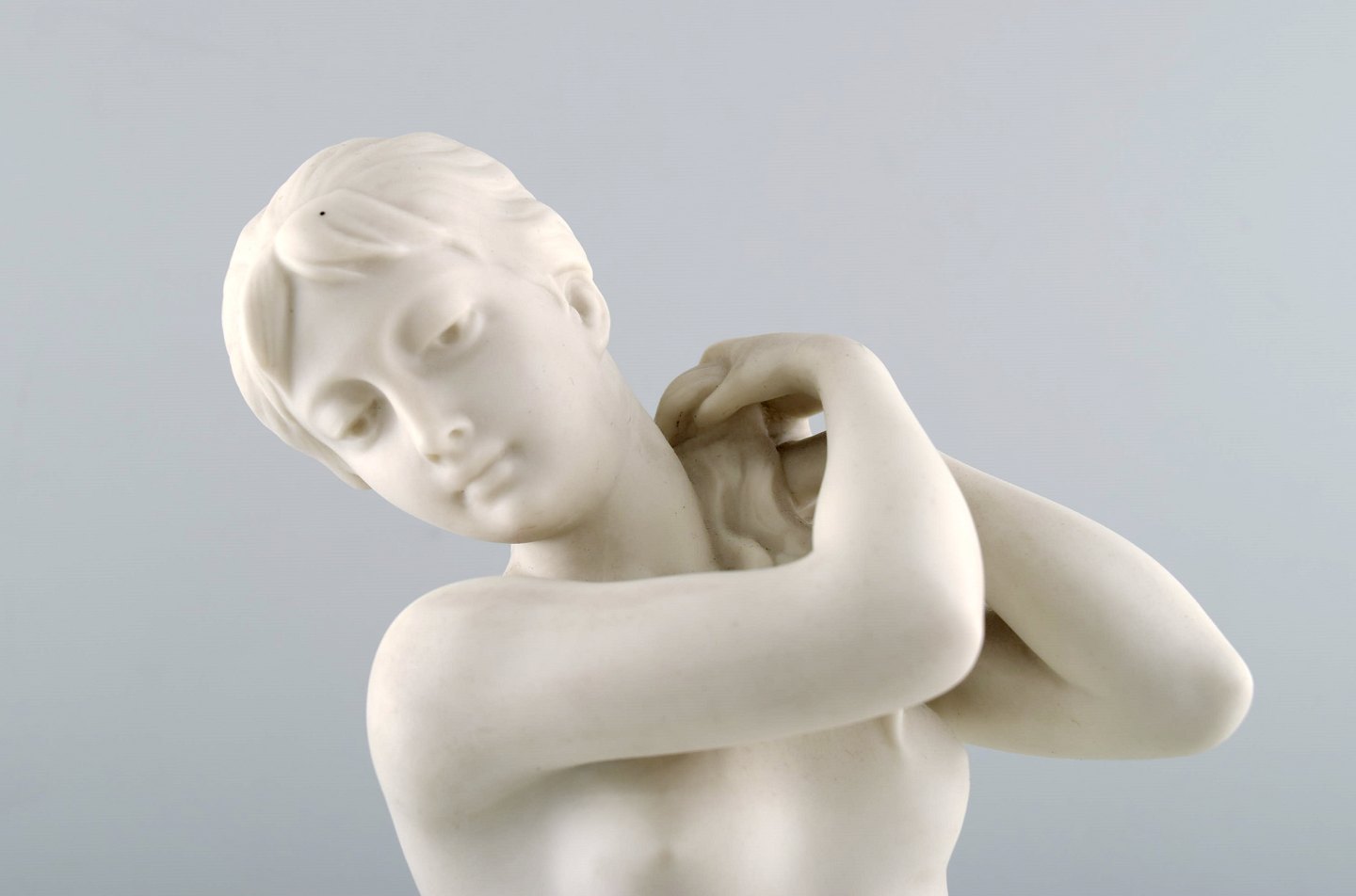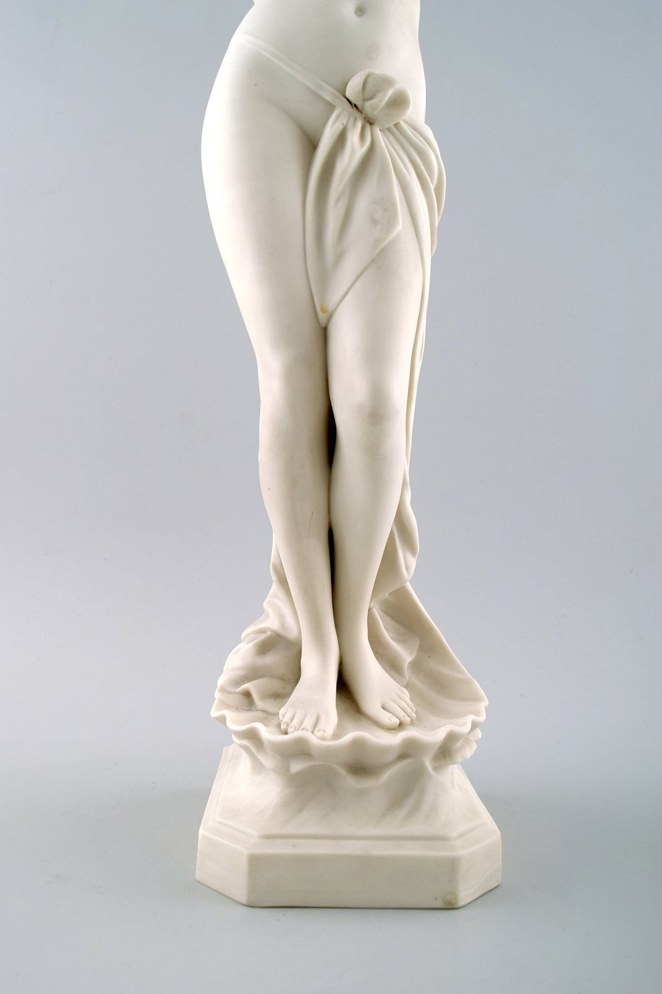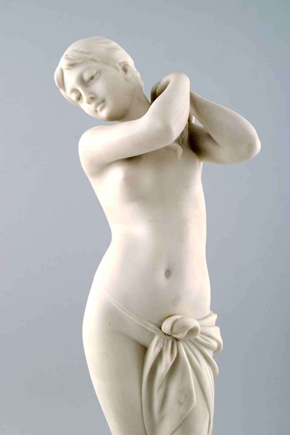 Klassisk skulptur af halvnøgen kvinde.