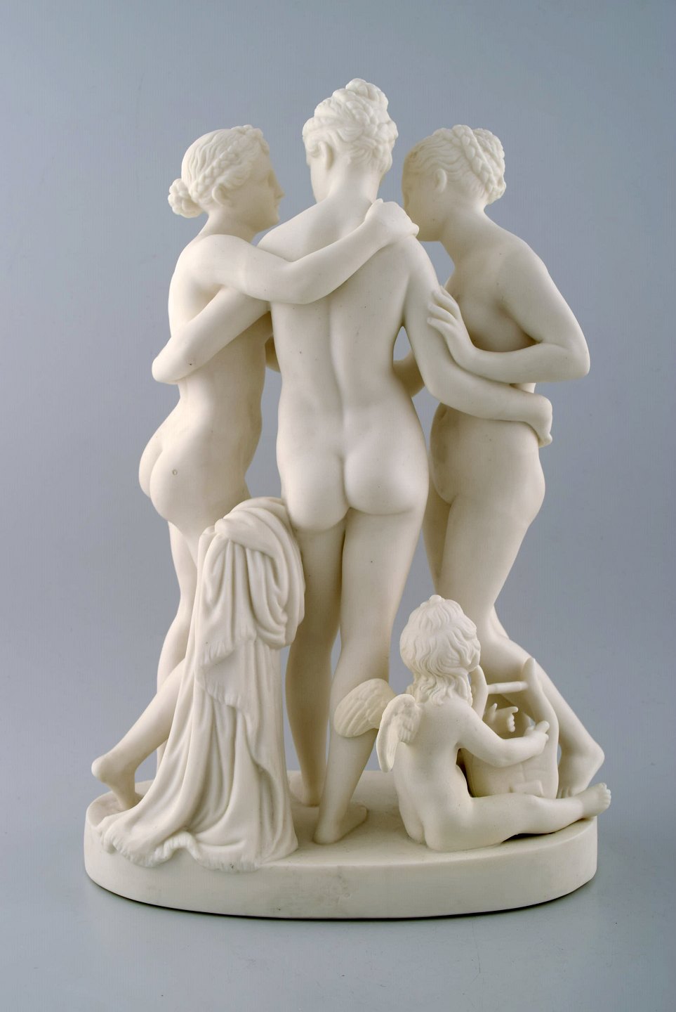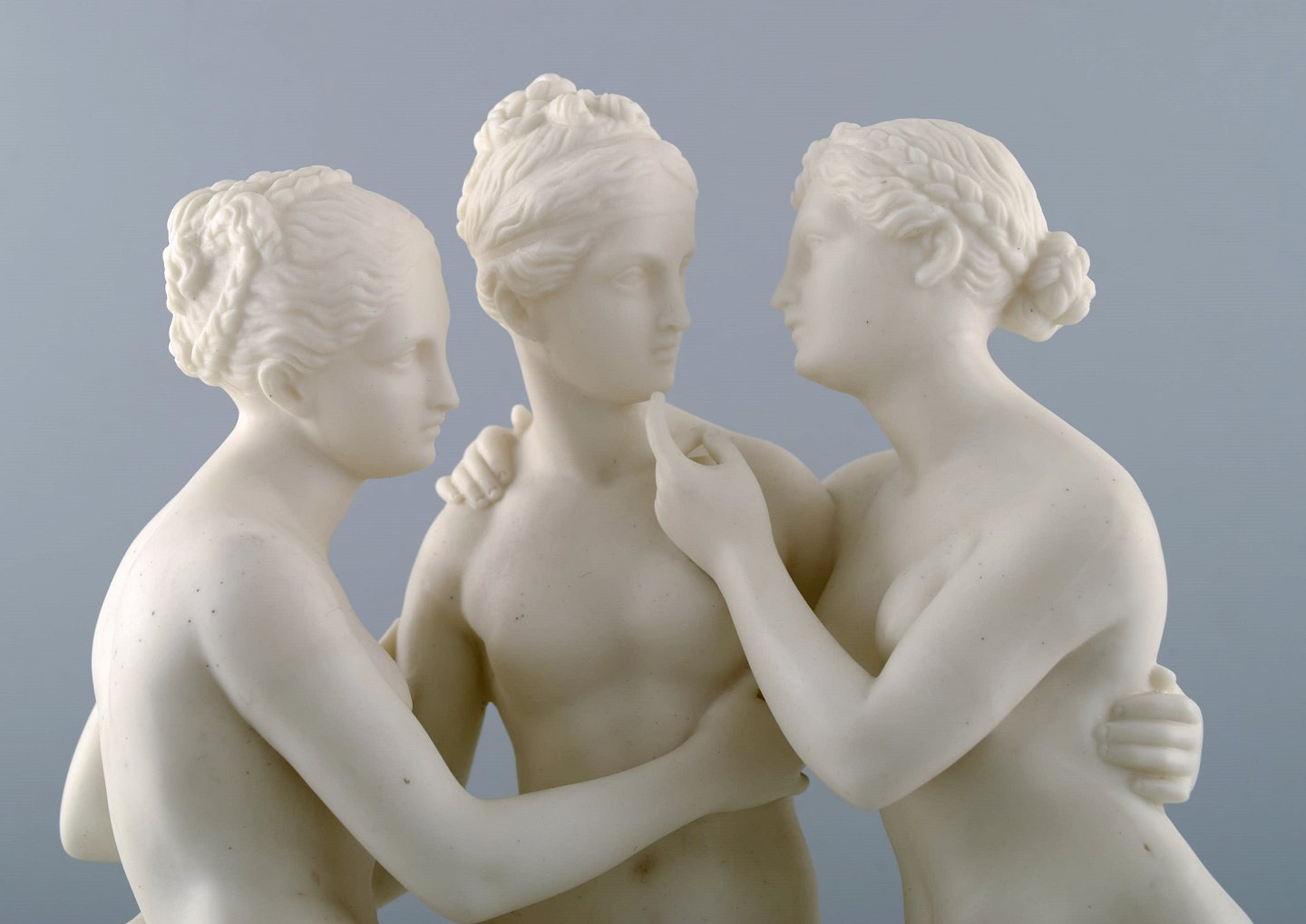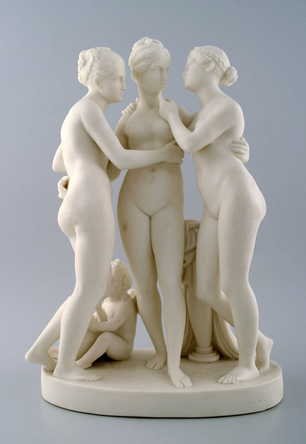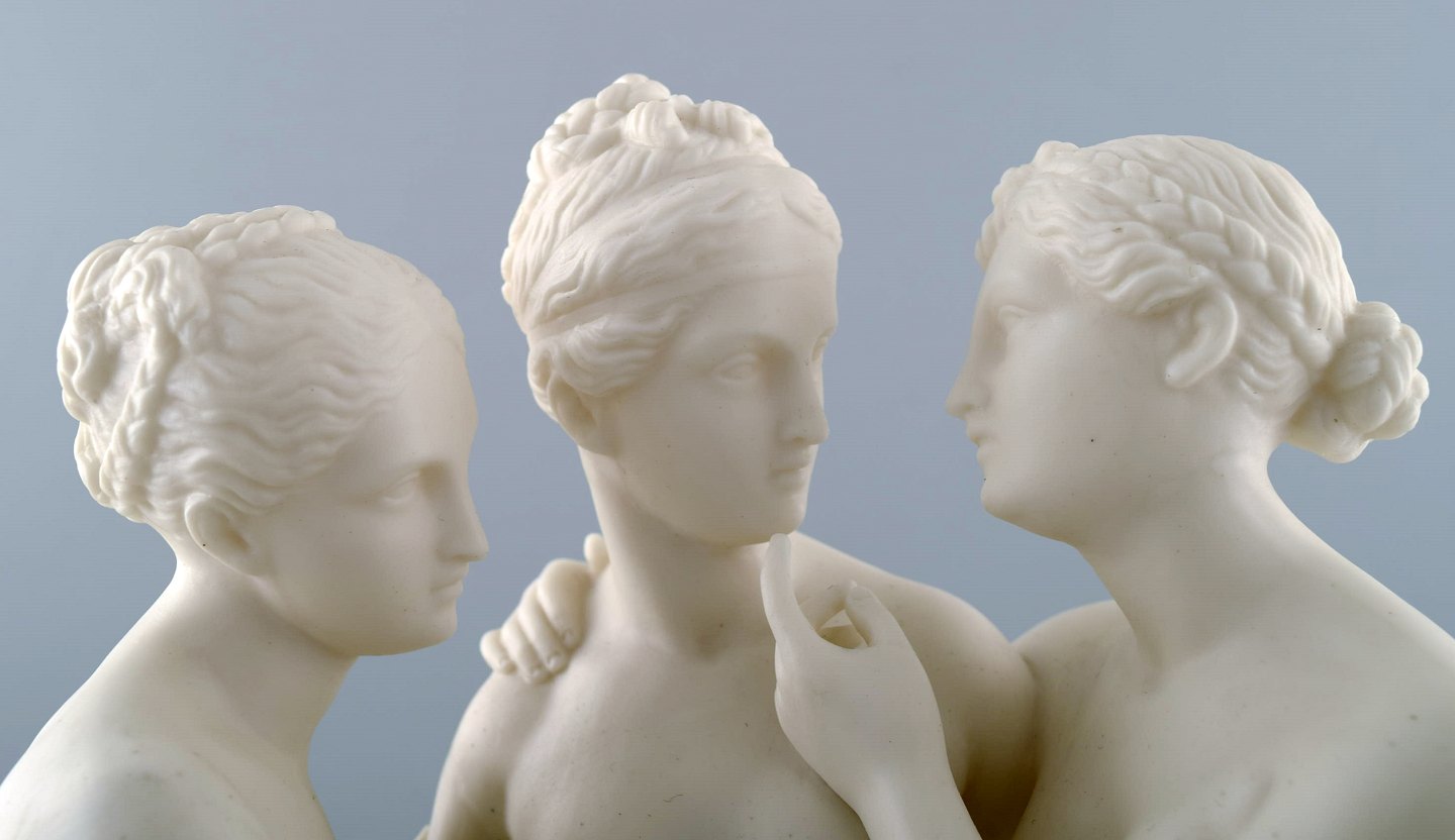 Klassisk skulptur i biscuit af "De tre gratier" på sokkel, Gustavsberg, sent 1800-tallet. Måler 37 cm. x 26 cm. I perfekt stand. Stemplet.