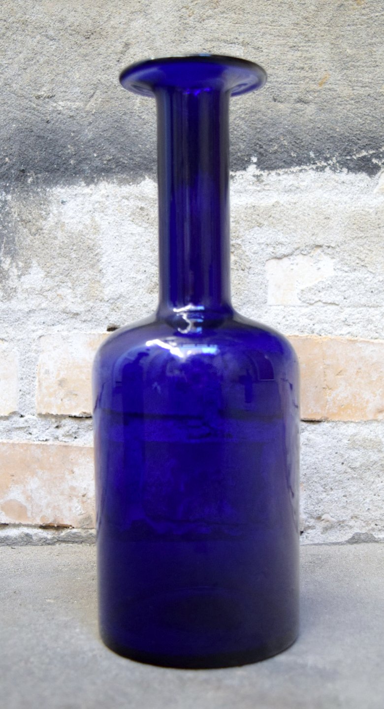 3 Holmegaard bottles in purple, Otto Brauer. Denmark, mid 20 c. design. Measures: Largest: 44 cm. X 17 cm. In perfect condition.