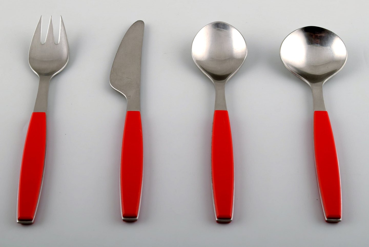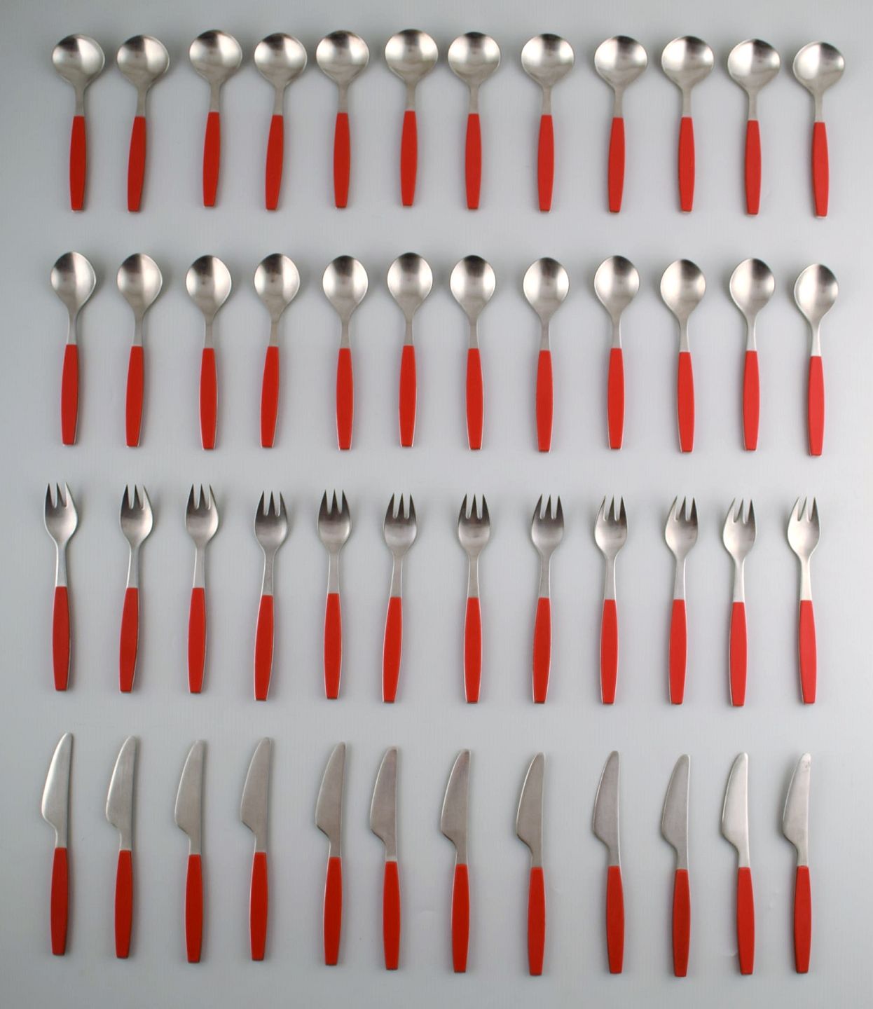 Complete service for 12 p., Henning Koppel. Strata cutlery made of stainless steel and red plastic. Produced by Georg Jensen.