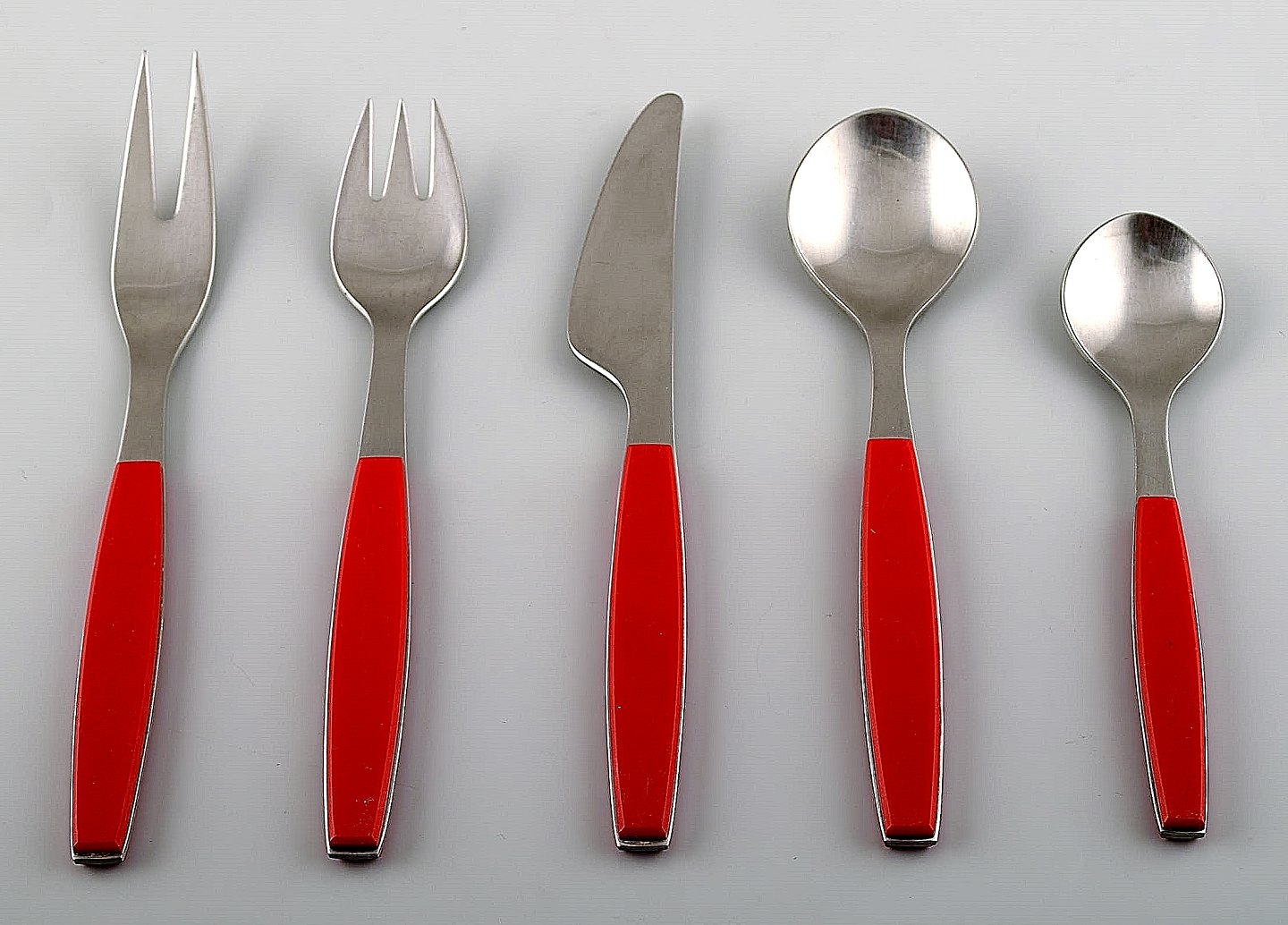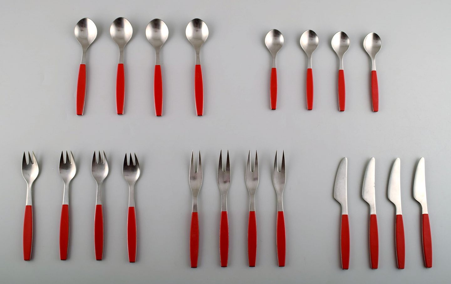 Komplet service til 4 p., Henning Koppel. Strata bestik af rustfrit stål og rød plast. Fremstillet hos Georg Jensen.