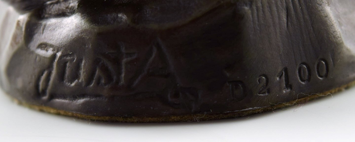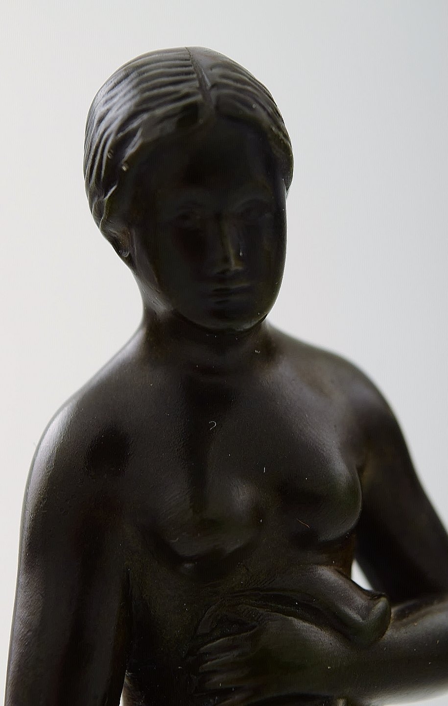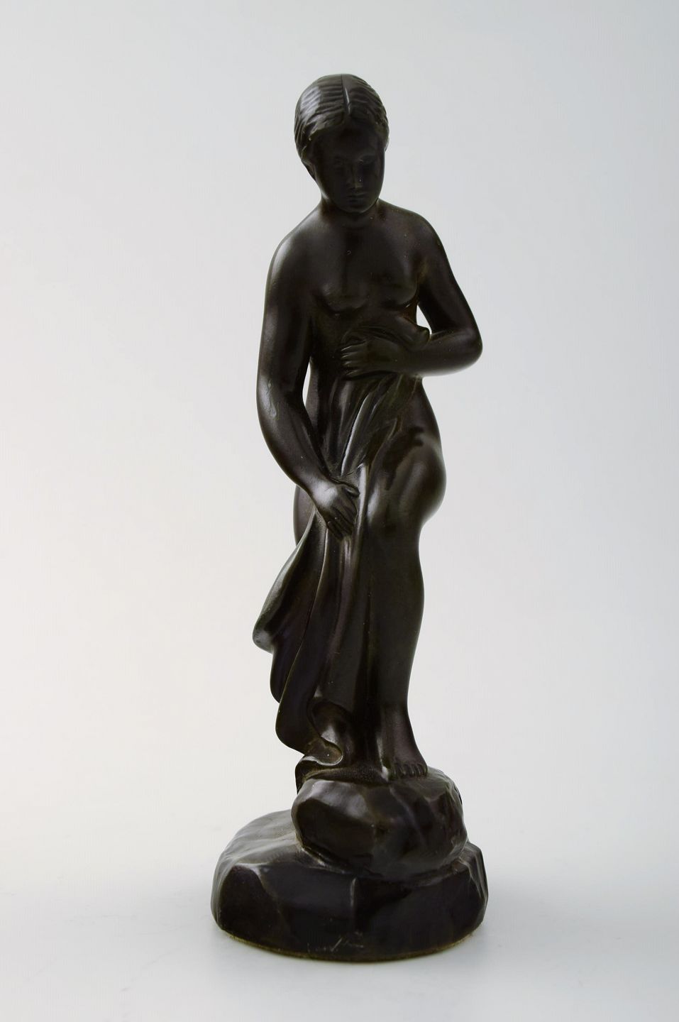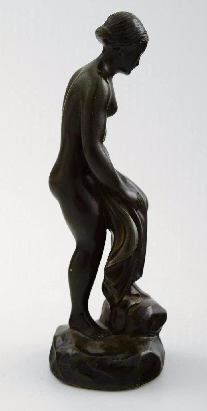 Figur af halvnøgen kvinde, designet af Just Andersen. Figuren er udformet i diskometal og signeret 'Just A'. Nummer 2100. Højde: 15 cm. I perfekt stand.