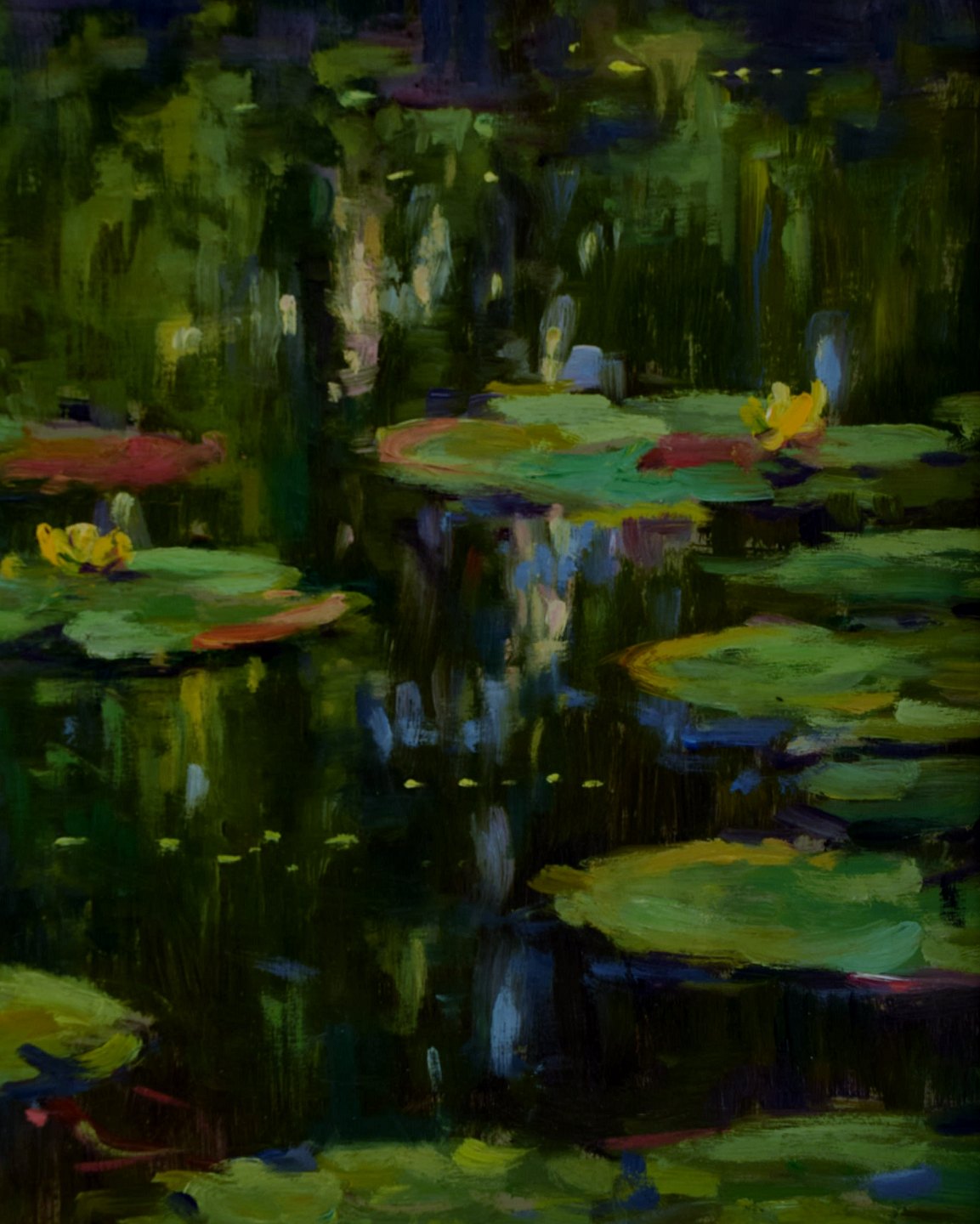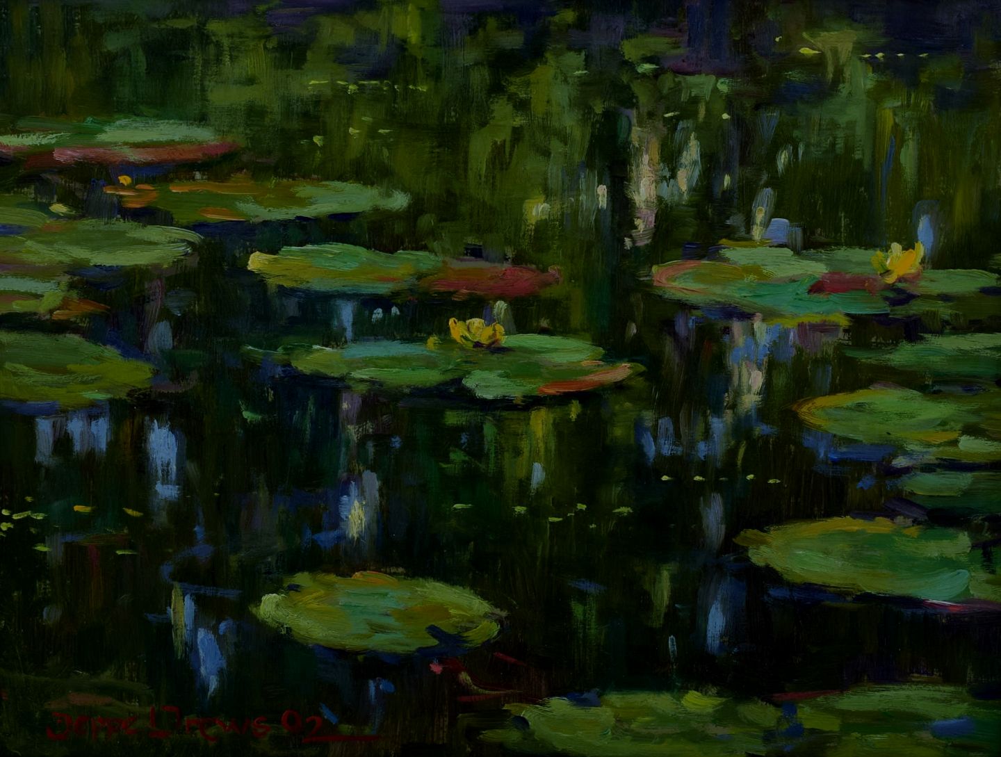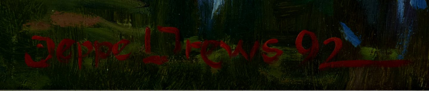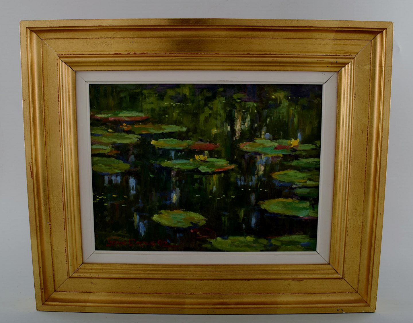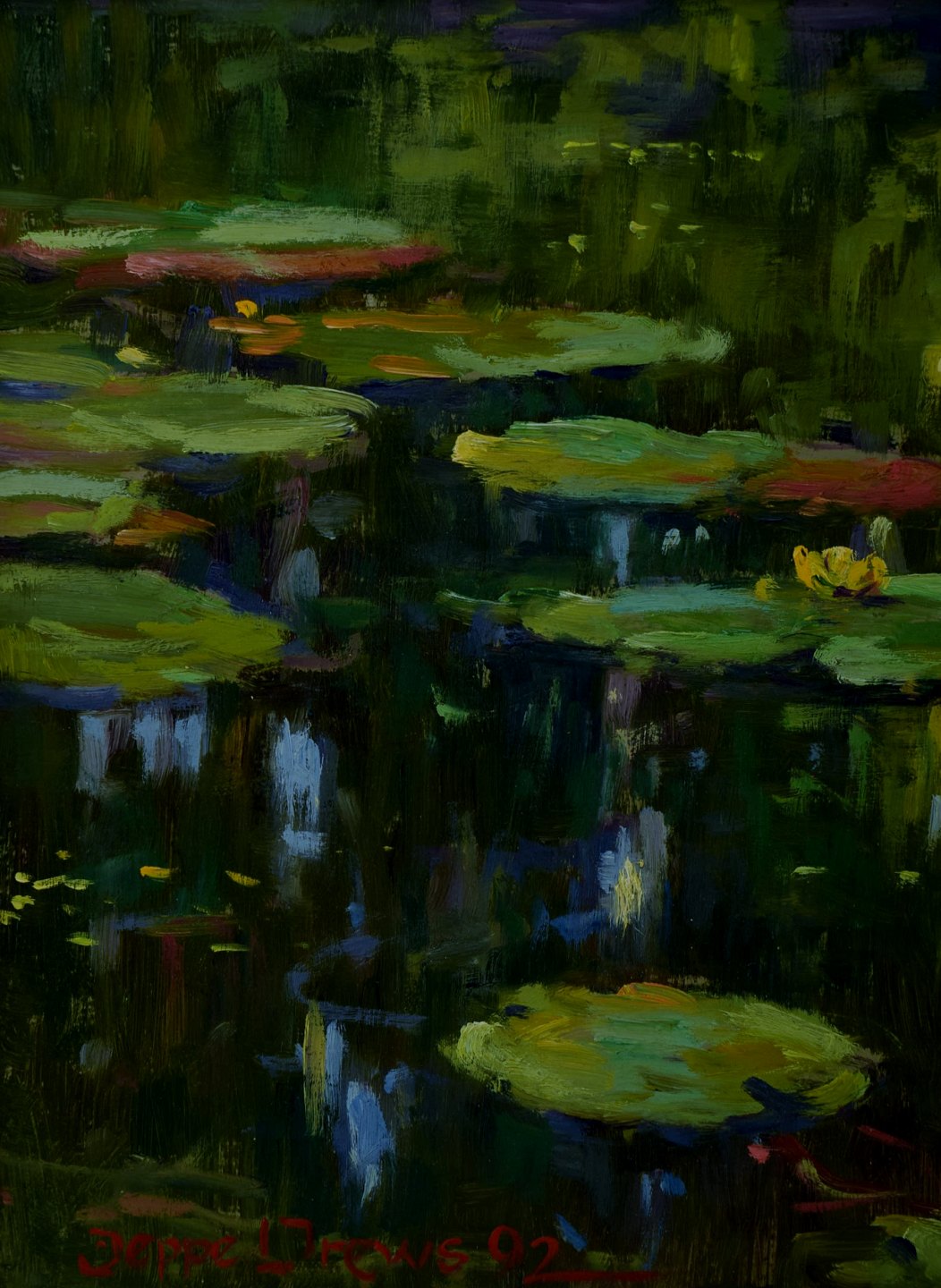 Jeppe Drews b. 1943. Danish artist. Water lilies. Oil on board. Signed: Jeppe Drews. 31 x 23 (39 x 31) cm. In perfect condition.