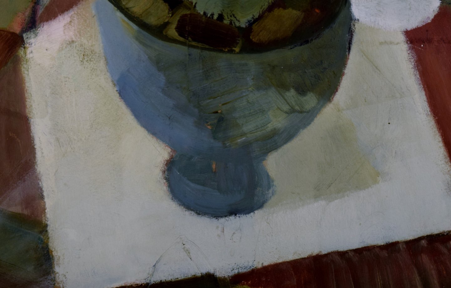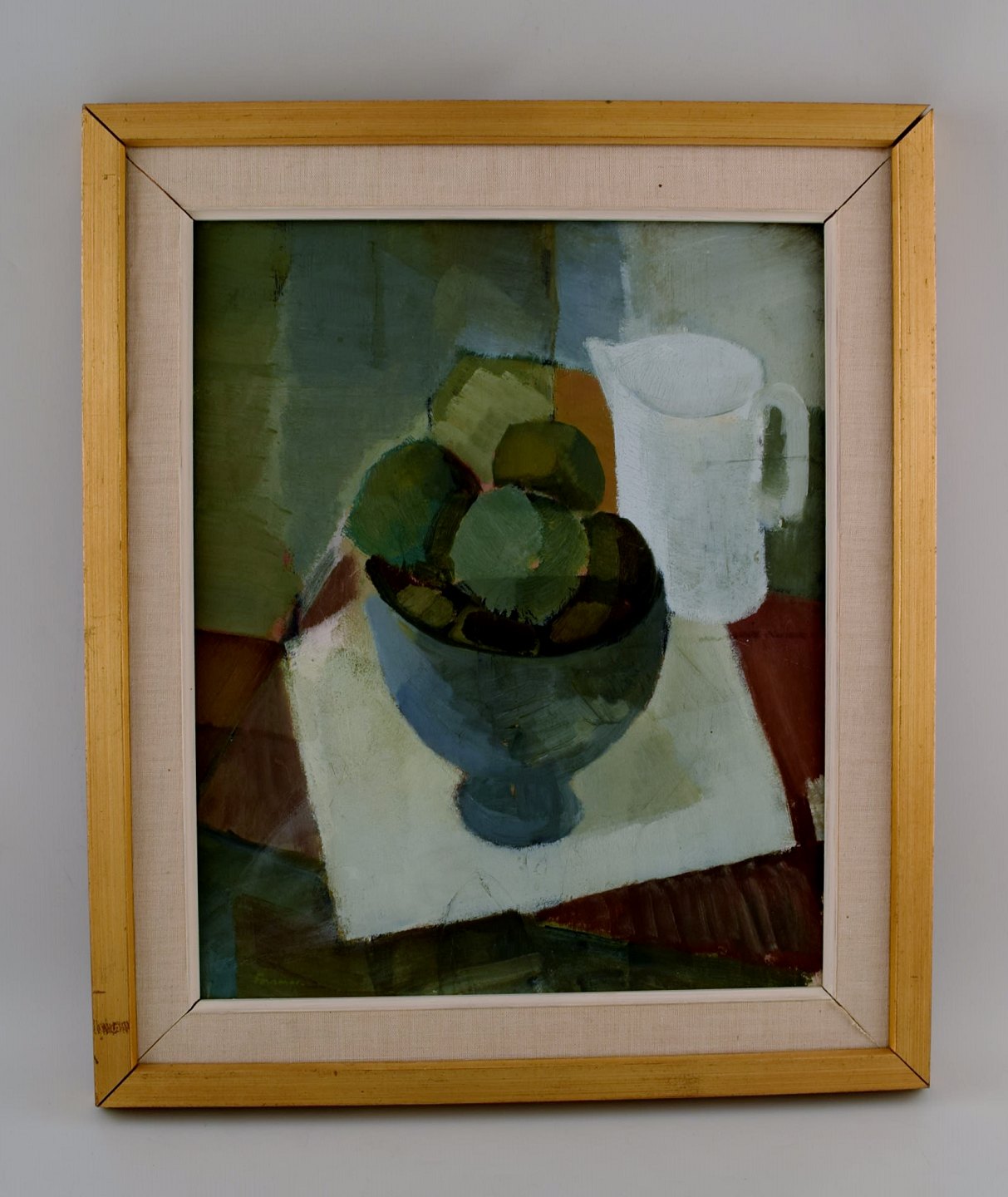 Oil on board. Mid 20 c., stillleben with fruits in bowl and jug. Signed illegible. Measures: 39 x 32 cm. The frame measures 2 cm.