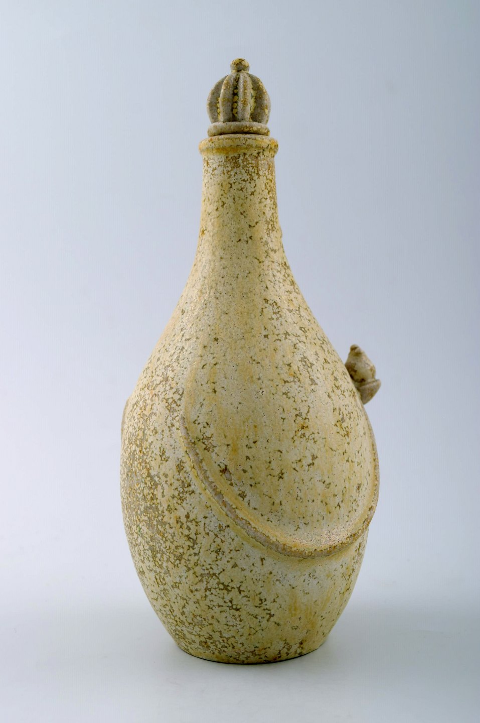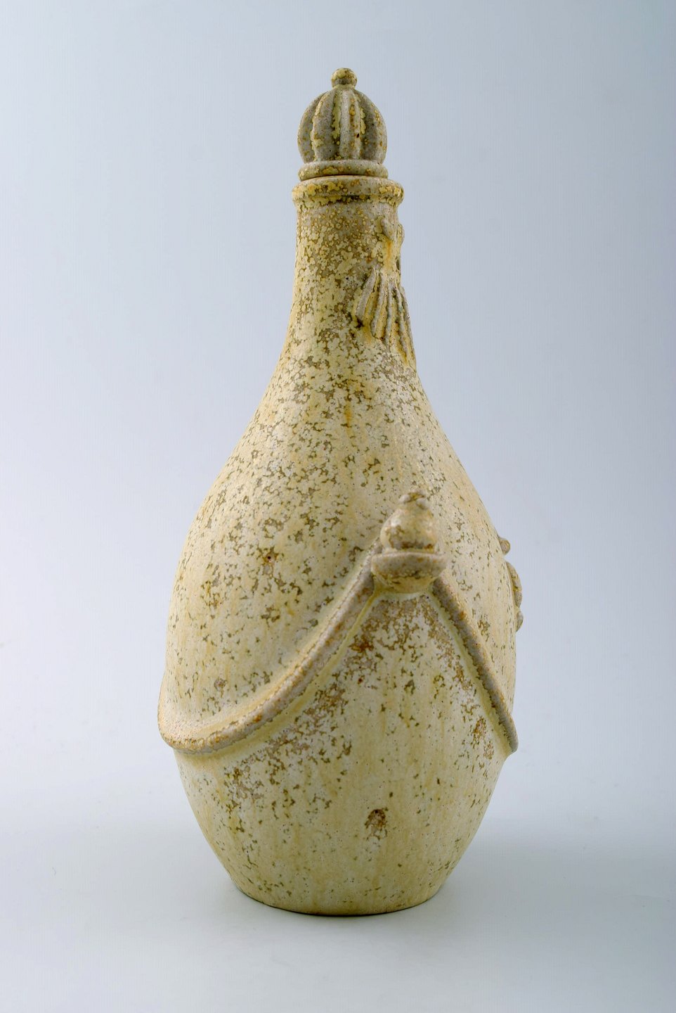 Sjælden Arne Bang. Keramik flaske/flakon med prop, "konge". 1940´erne. Flot glasur i sand nuancer. I perfekt stand. Usigneret. Måler: 19 x 9 cm.