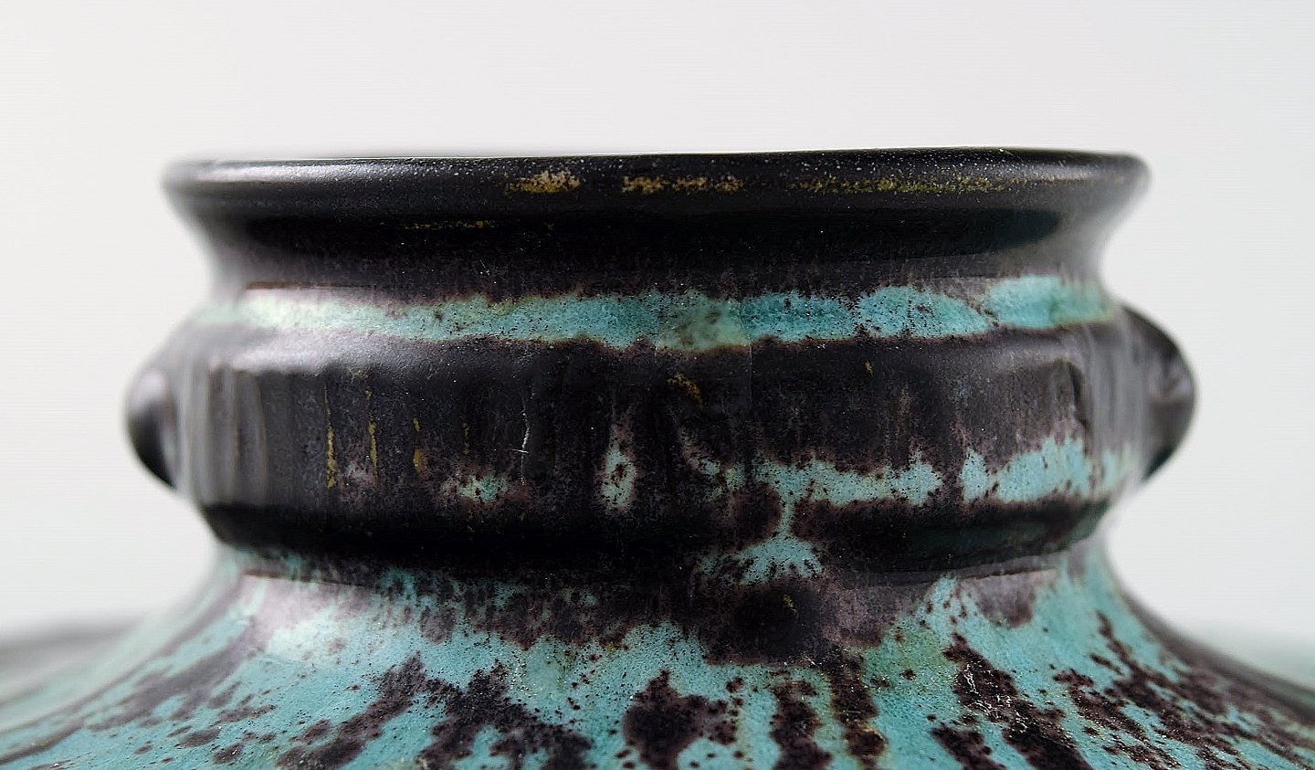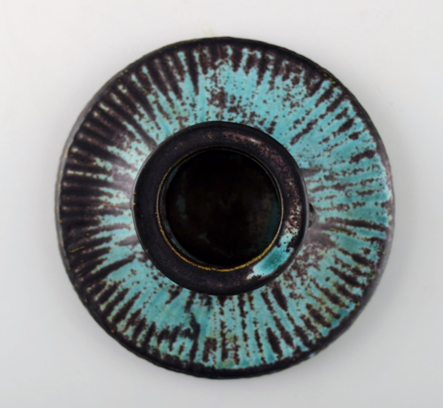 Svend Hammershoi for Kähler, Denmark, glazed candlestick, 1930s. Designed by Svend Hammershoi. Glaze in black and green. Measures 13 x 5 cm. Marked. In perfect condition.