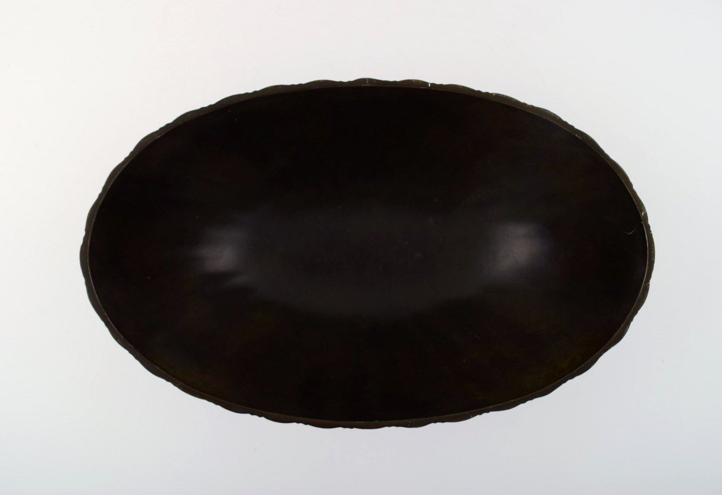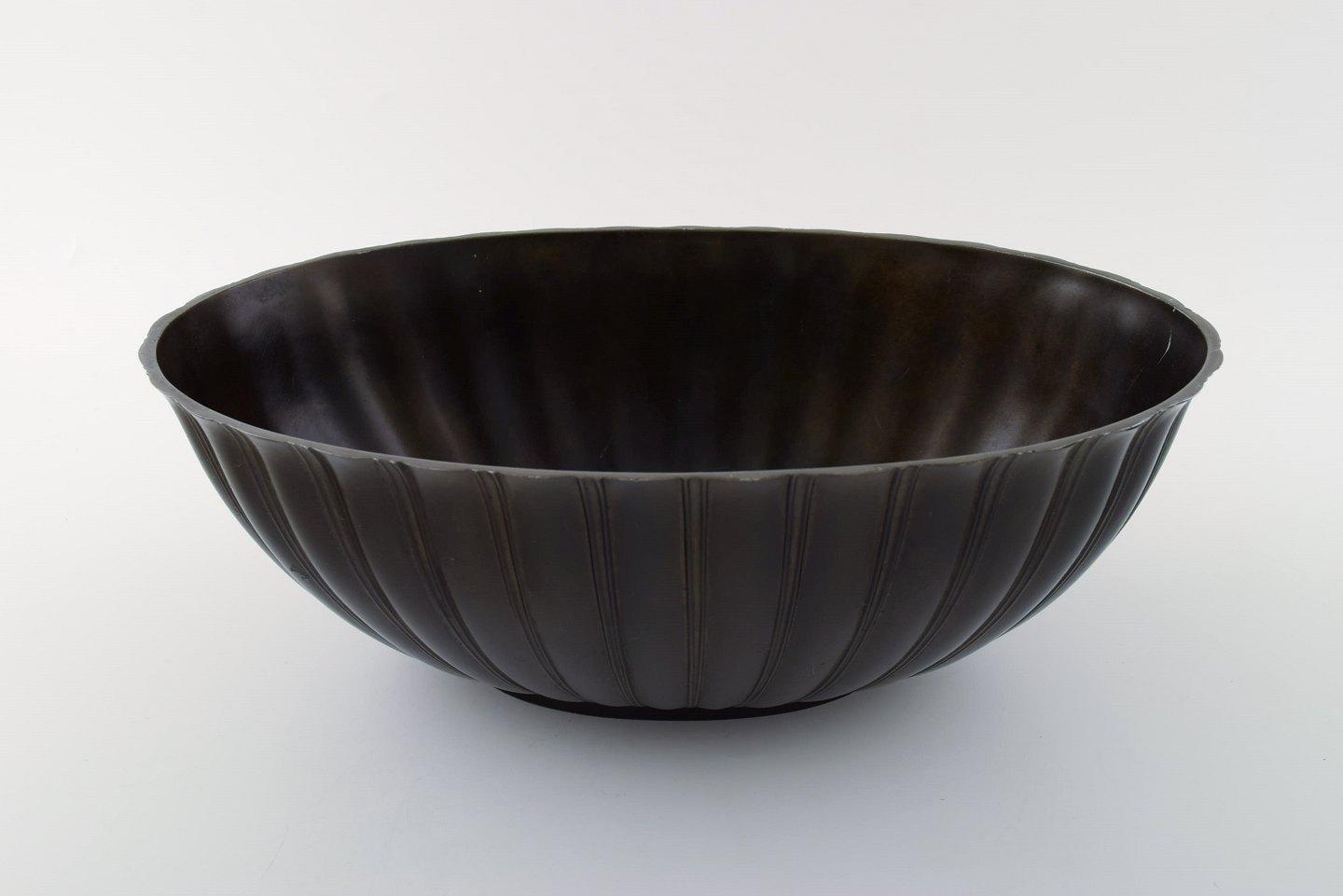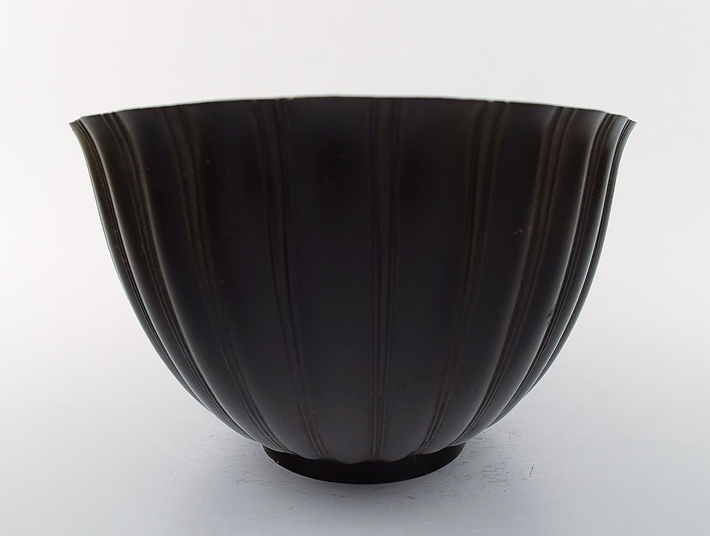 Just Andersen. Jardiniere af patineret diskometal med rillet korpus. Stemplet Just Danmark, nr. 1752. Måler : 31,5 cm. x 12 cm. I flot stand.